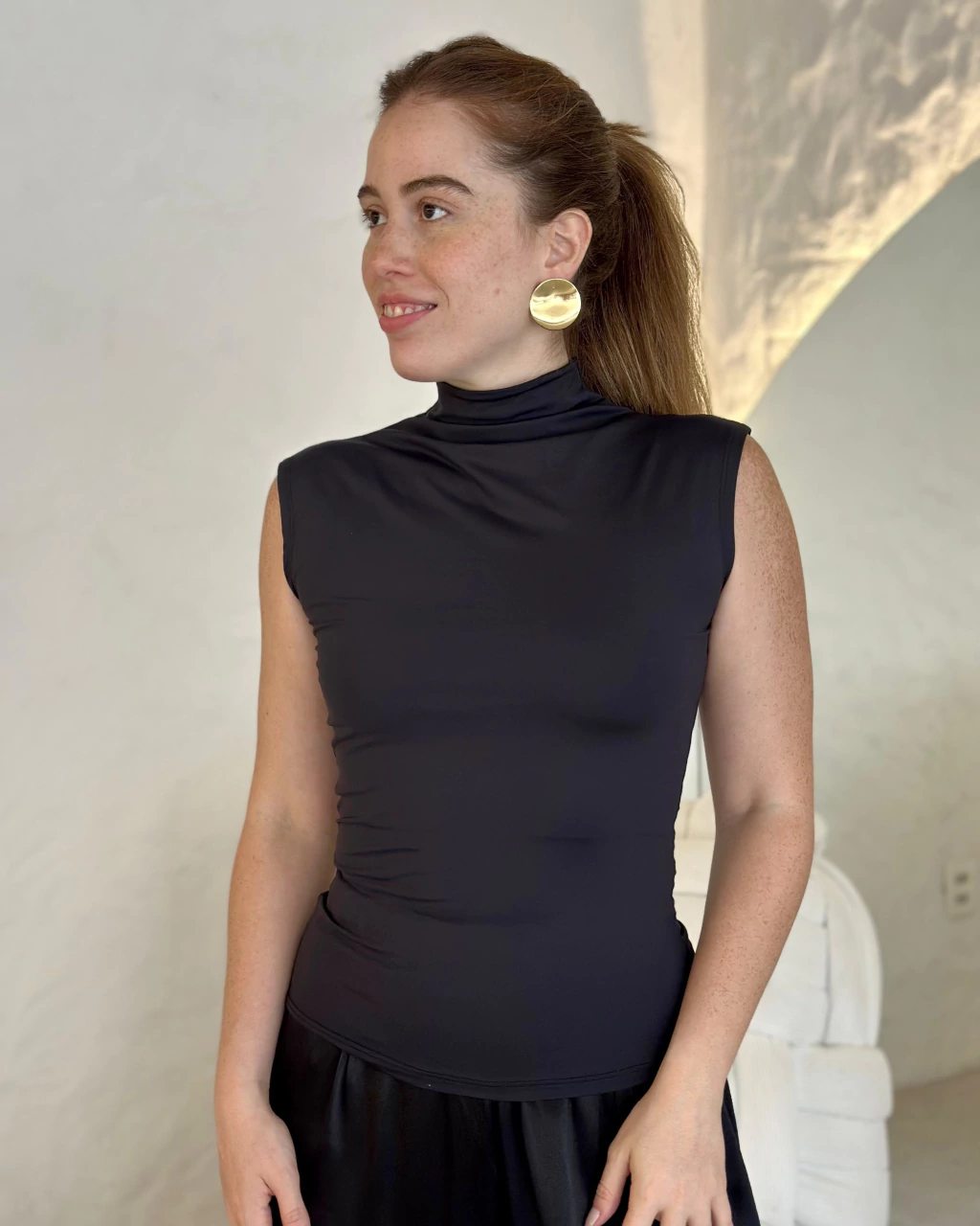 A blusa Amanda é a escolha perfeita para quem busca elegância com um toque contemporâneo. Confeccionada em tecido leve de acabamento levemente brilhoso, ela oferece um caimento impecável que valoriza a silhueta. O modelo sem mangas conta com gola alta e detalhe drapeado lateral, criando um efeito sofisticado e moderno.