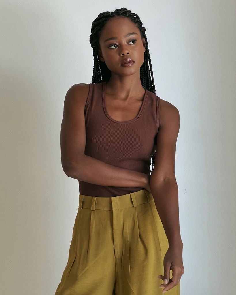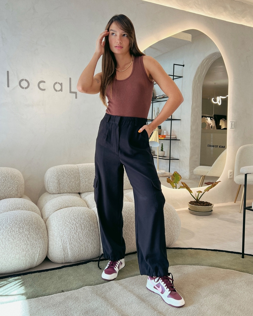 Body confeccionado em malha de algodão canelado (100% algodão). Possui decote redondo, alças largas, caimento ajustado ao corpo e fechamento entrepernas por colchetes.