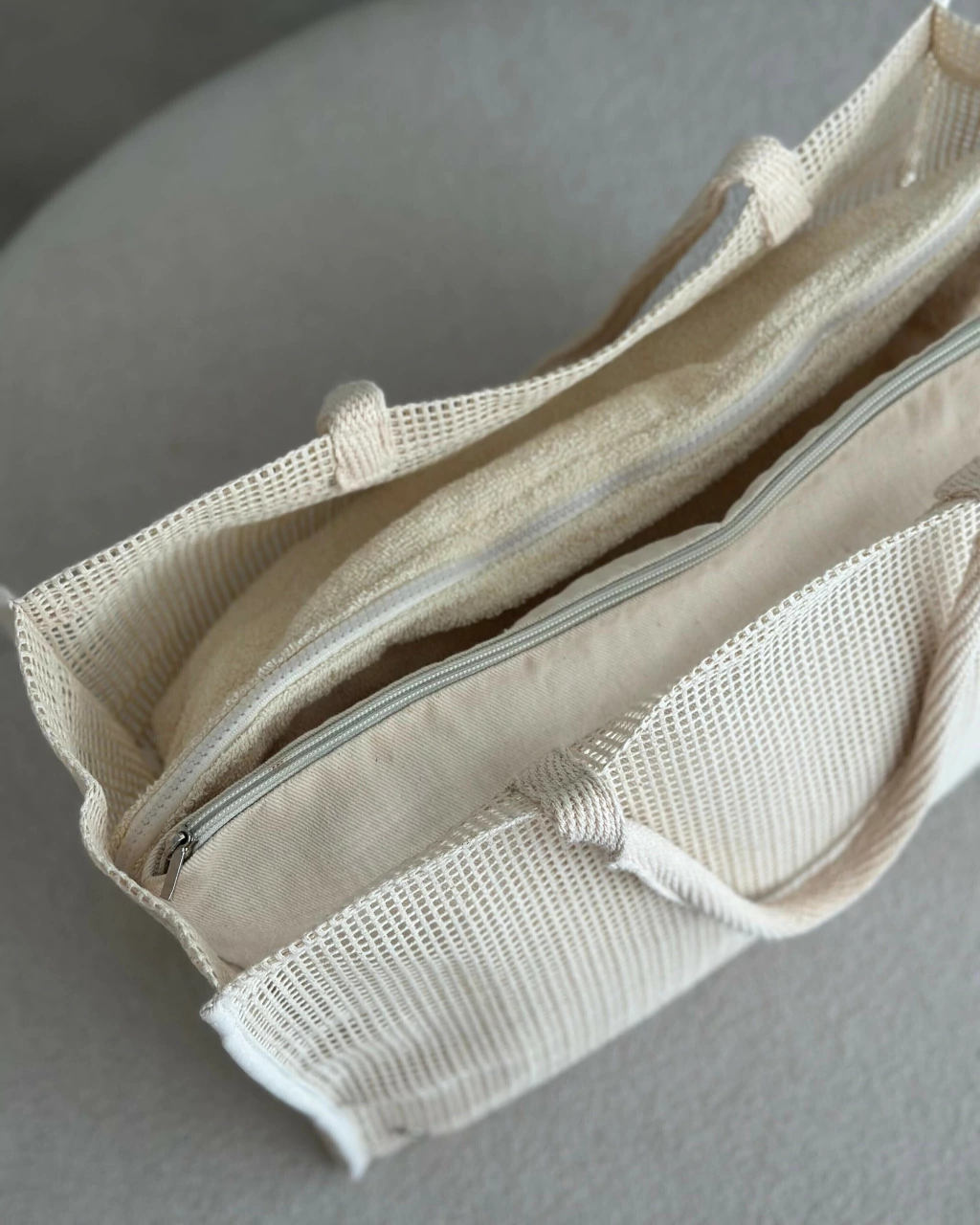 Com design leve e moderno, a Plage é feita em tela crú com alças reforçadas e acompanha duas bolsas internas removíveis: uma em tecido atoalhado, ideal para itens úmidos, e outra em sarja, perfeita para objetos pessoais. Essencial para dias de sol com estilo e praticidade.
