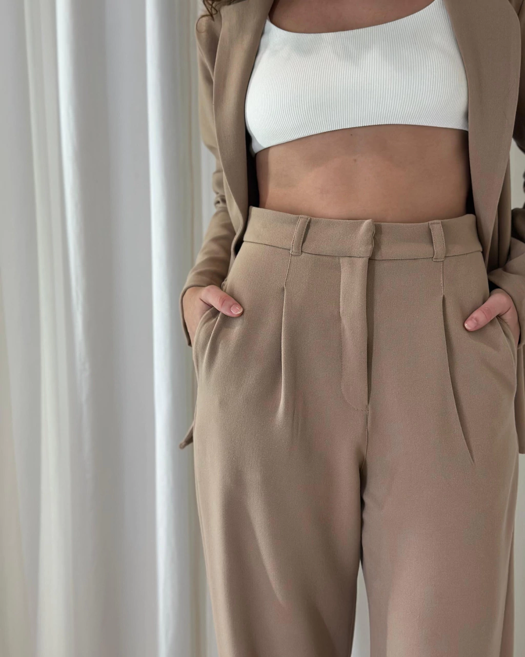 Calça de alfaiataria caramelo em tecido leve, com modelagem reta e caimento amplo. Possui cintura alta com cós estruturado e passantes, pregas frontais, bolsos faca laterais e bolsos decorativos atrás. Fechamento por zíper e colchete. Sofisticada e versátil, ideal para compor looks elegantes ou modernos no dia a dia.