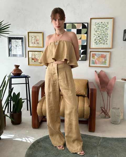 A Calça Beirute é sinônimo de elegância natural e frescor. Feita em tecido de linho leve, com caimento fluido e toque rústico sofisticado, ela é perfeita para compor looks versáteis nos dias mais quentes.