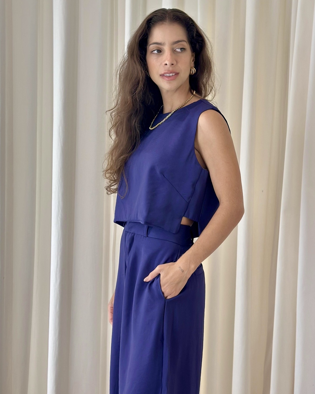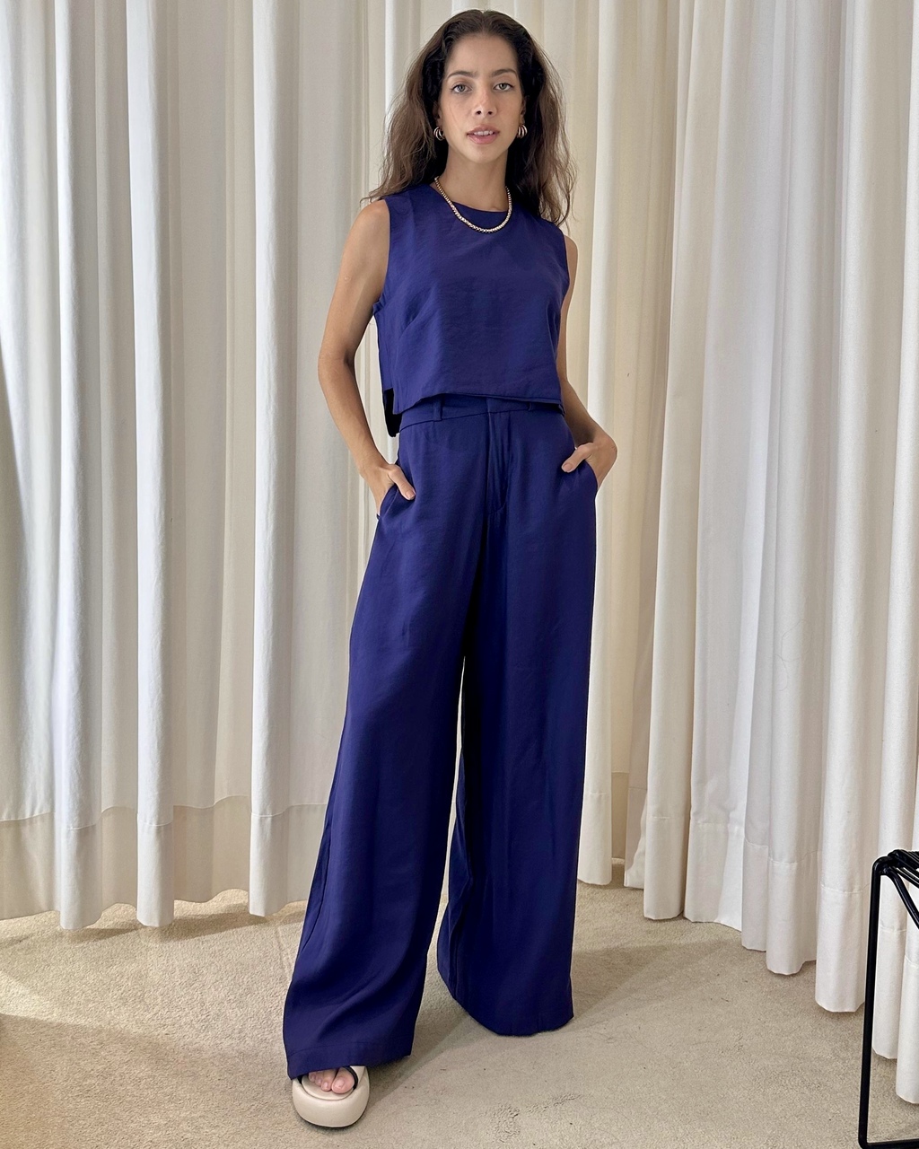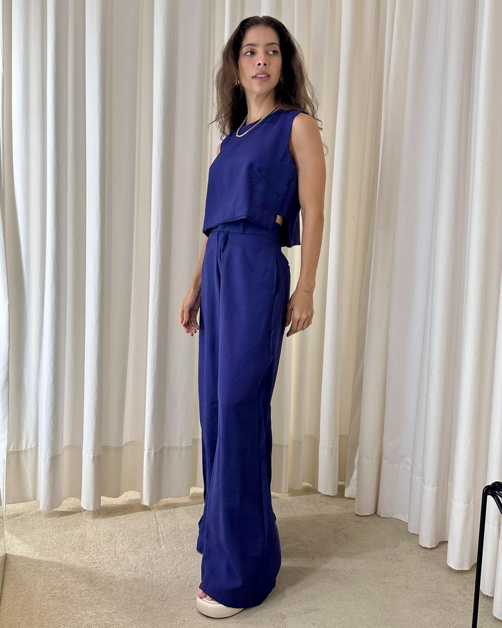 Calça confeccionada em crepe (90% viscose, 10% poliester), possui cintura alta, bolso faca e posterior, fechamento em cochetes e zíper invisível, caimento reto com as barras mais amplas. Moderno, confortável e com a modelagem certa para os looks mais casuais.