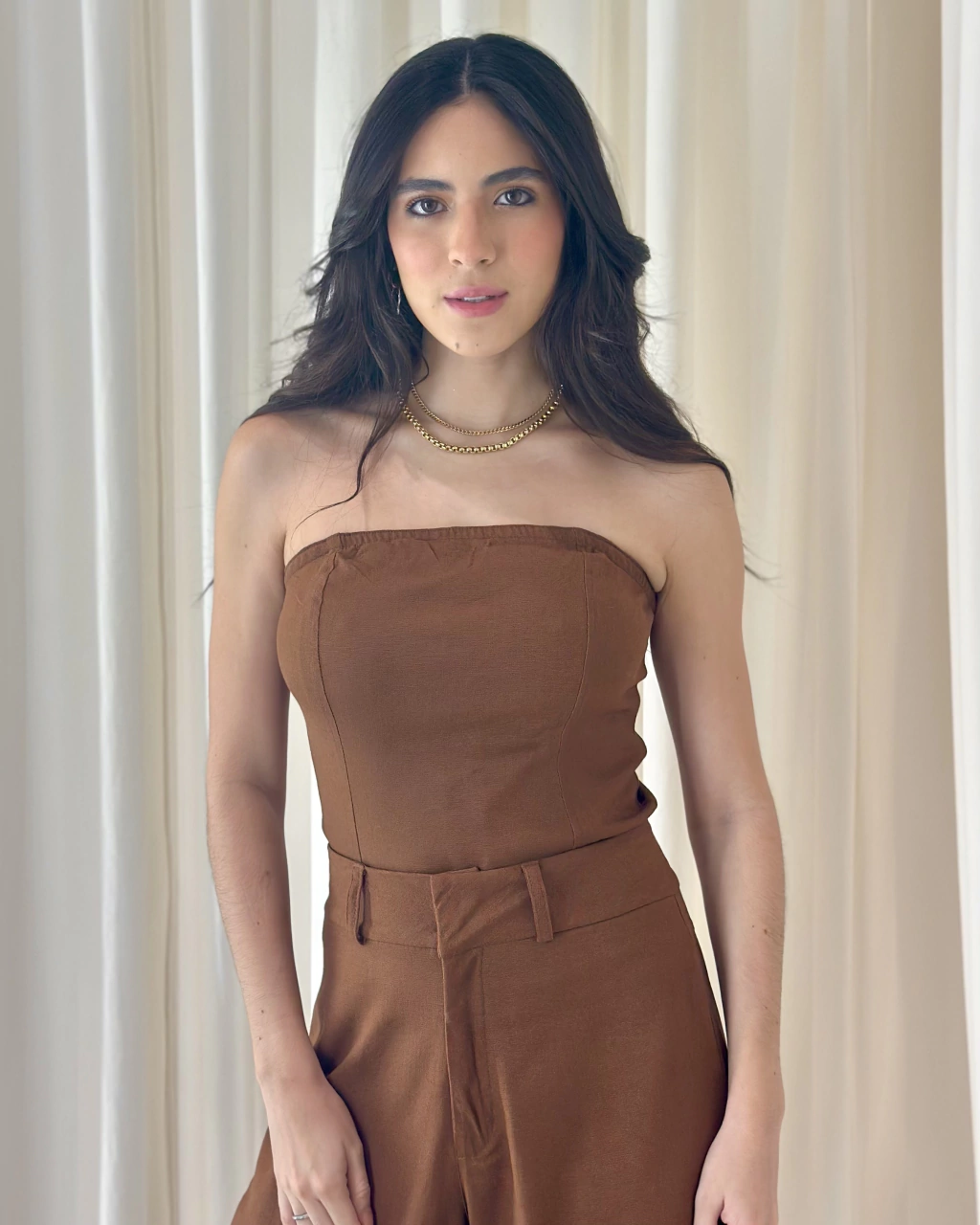 Calça com shape wid leg em linho conficcionado em tecido plano (70% viscose, 27% linho, 3% elastano) com cintura alta e cós largo, detalhe de pregas e bolsos frontais, fechamento em cochetes e detalhe de barra dobrada.