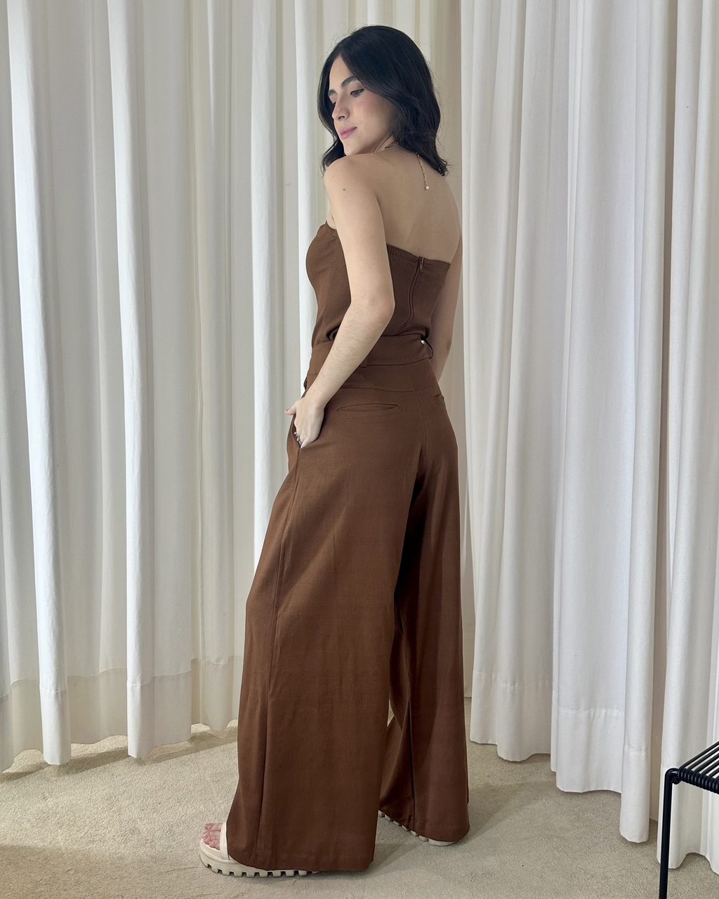 Calça com shape wid leg em linho conficcionado em tecido plano (70% viscose, 27% linho, 3% elastano) com cintura alta e cós largo, detalhe de pregas e bolsos frontais, fechamento em cochetes e detalhe de barra dobrada.
