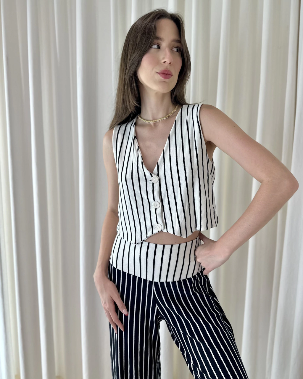 Calça confeccionada em tecido de malha canelada (92% poliéster 8% elastano), possui cintura alta com cós largo no mesmo tecido. Possui shape mais ajustado na área do quadril e amplo na barra.