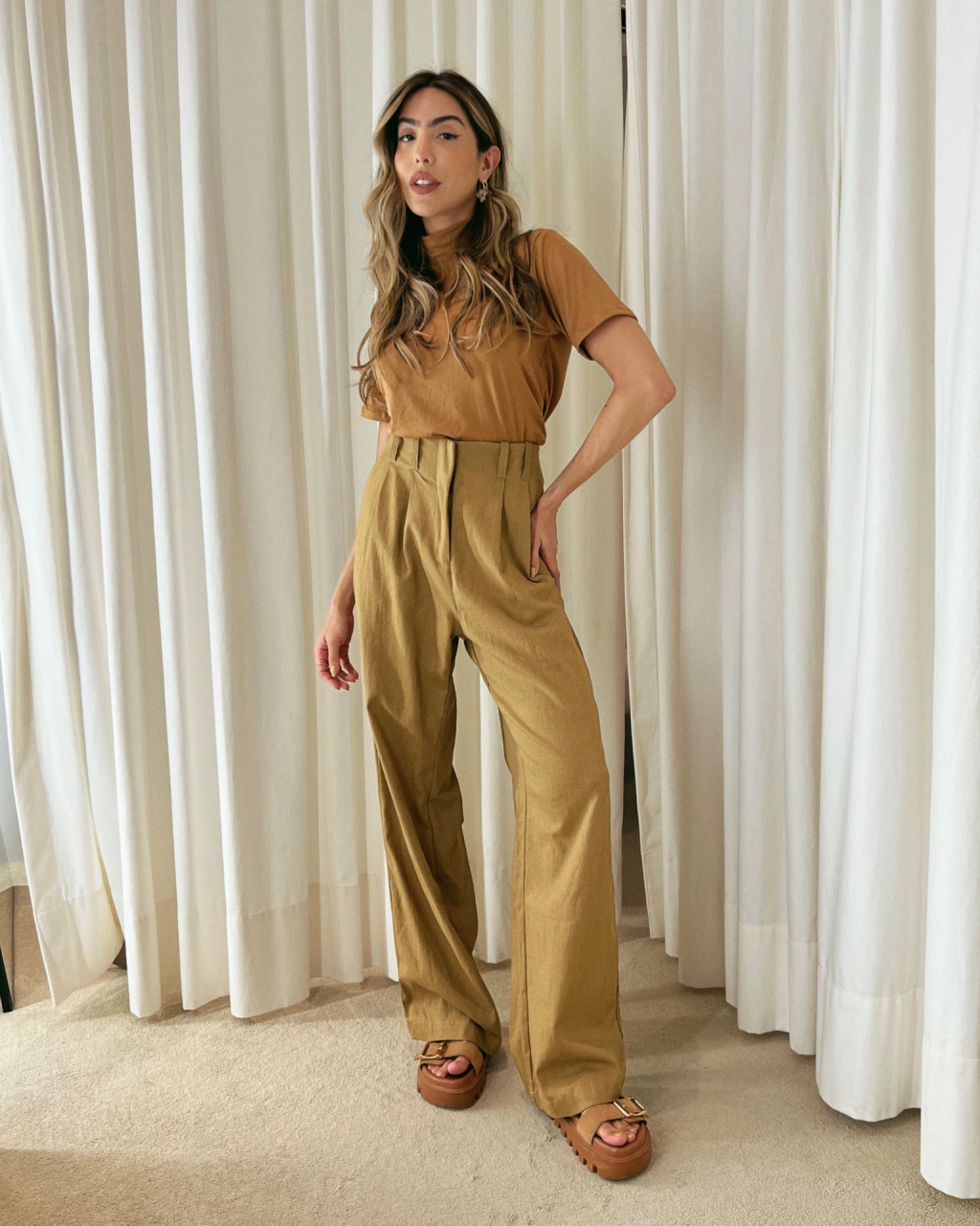 Calça com shape de alfaiataria em viscose e linho (68% viscose 30% linho 2% elastano) cintura alta, caimento reto, cós com fechamento em zíper interno, pregas frontais, bolsos laterais e posteriores.