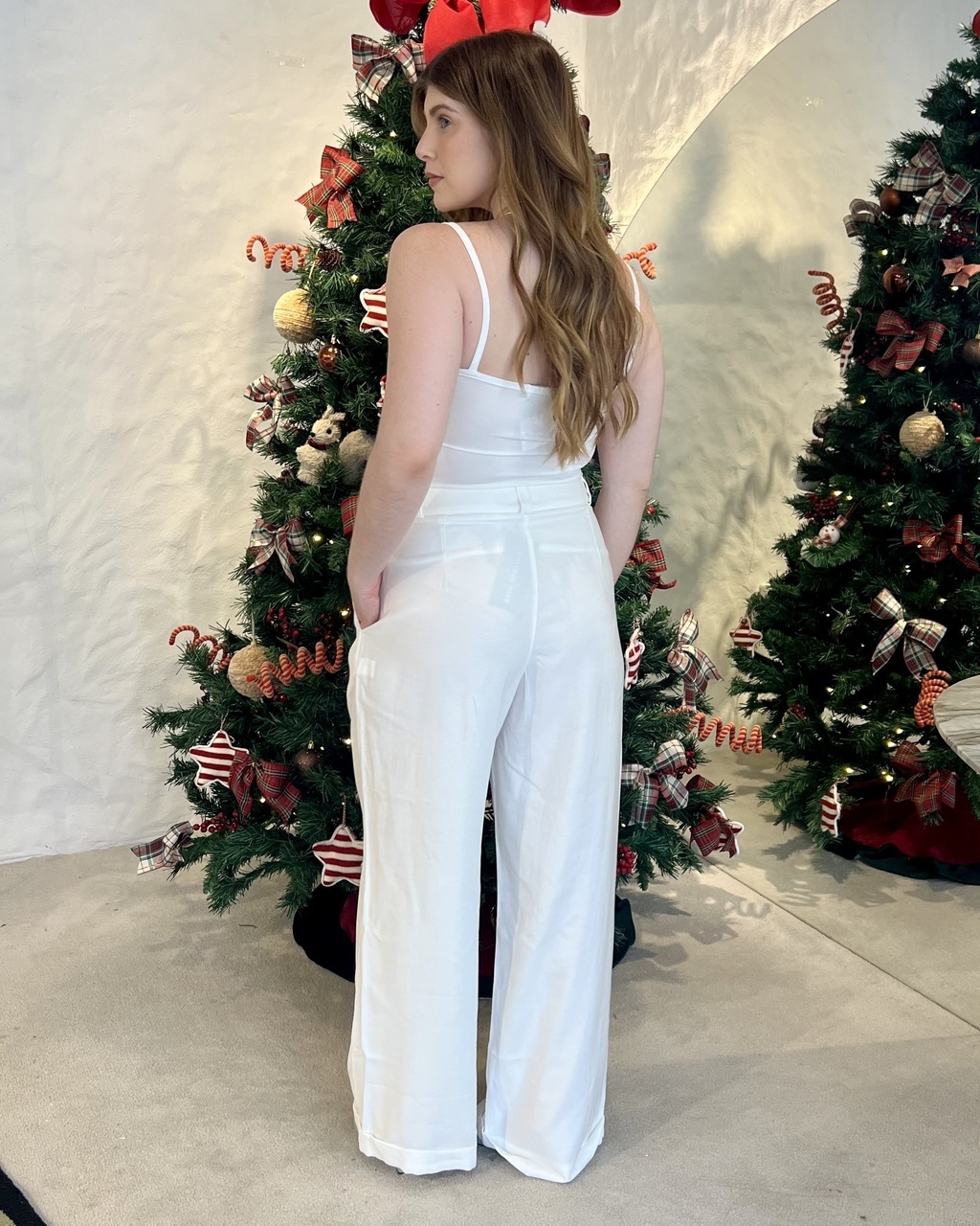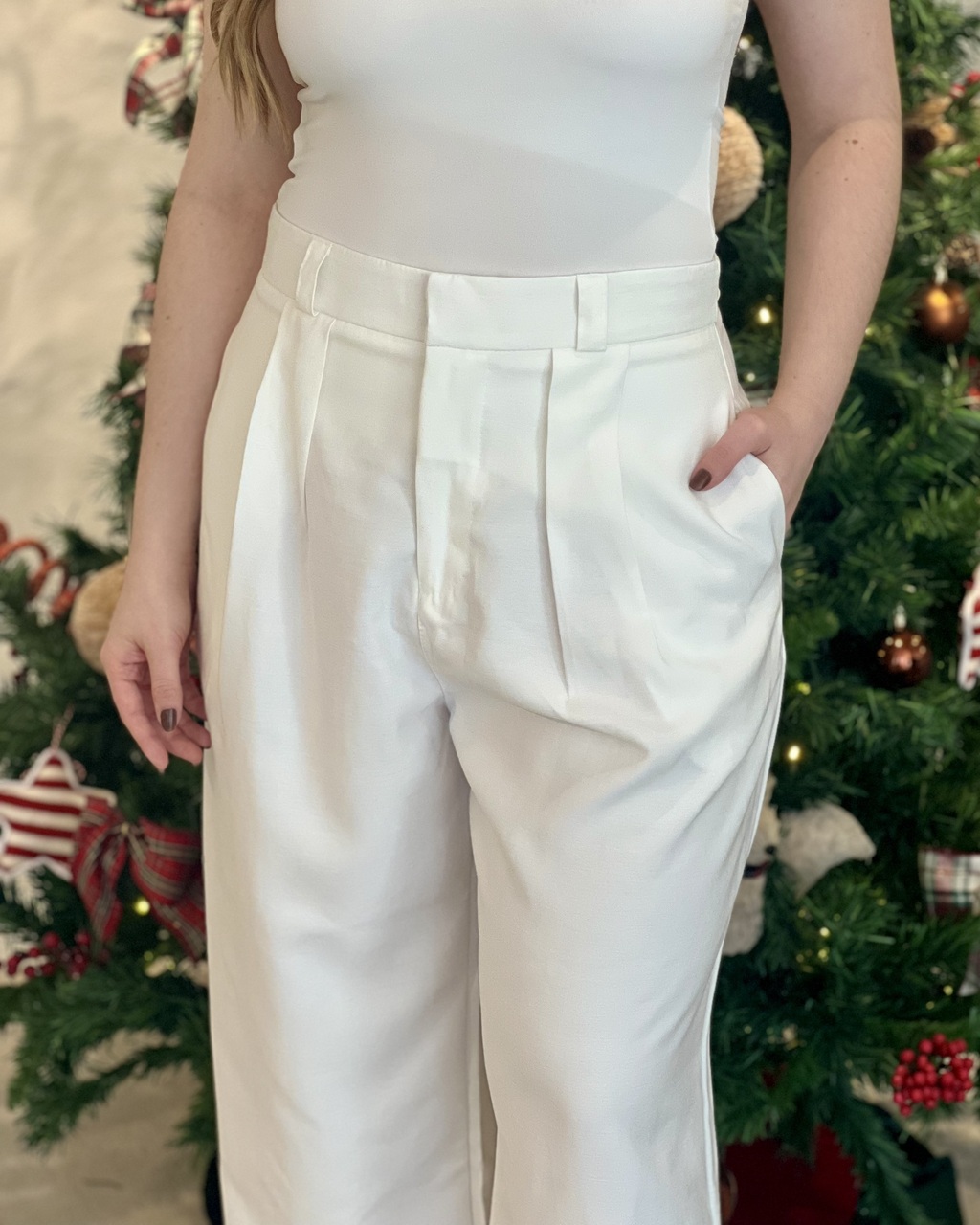 Calça com shape wid leg em linho conficcionado em tecido plano (92% viscose 8% elastano) com cintura alta e cós largo, detalhe de pregas e bolsos frontais, fechamento em cochetes e detalhe de barra dobrada.