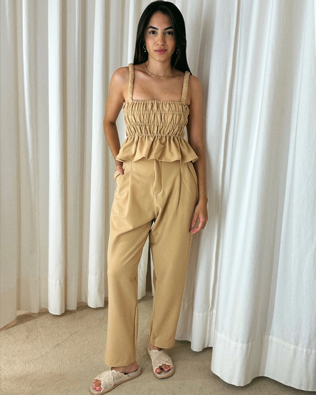 A nossa calça minimal confeccionada em tecido plano (85% poliéster 12% viscose 3% elastano), shape reto, detalhe de elástico na área posterior do cós, fechamento em cochete e zíper invisíveis, bolsos laterais e posteriores.