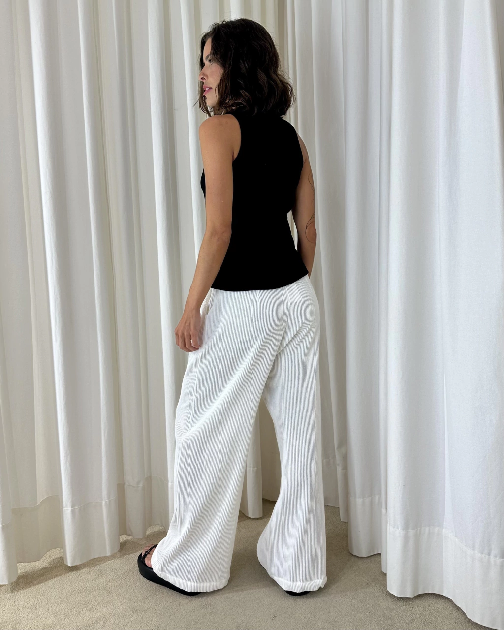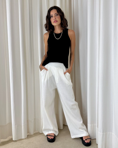Calça em malha super encorpada com texturas em relevo (72% algodão 28% poliéster). Possui cós com elástico, bolsos faca e pregas frontais. Shape wide leg com comprimento acima do tornozelo.