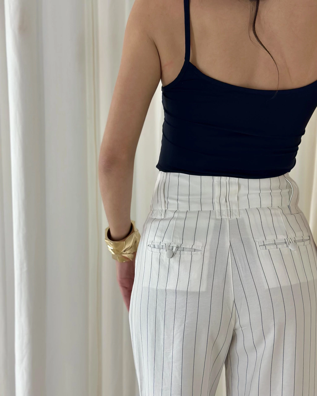 Calça com shape wid leg confeccionada em tecido plano (92% viscose, 8% elastano) com cintura alta e cós largo, detalhe de pregas e bolsos frontais, fechamento em cochetes, dois bolsos posteriores embutidos com detalhe de botão encapado.