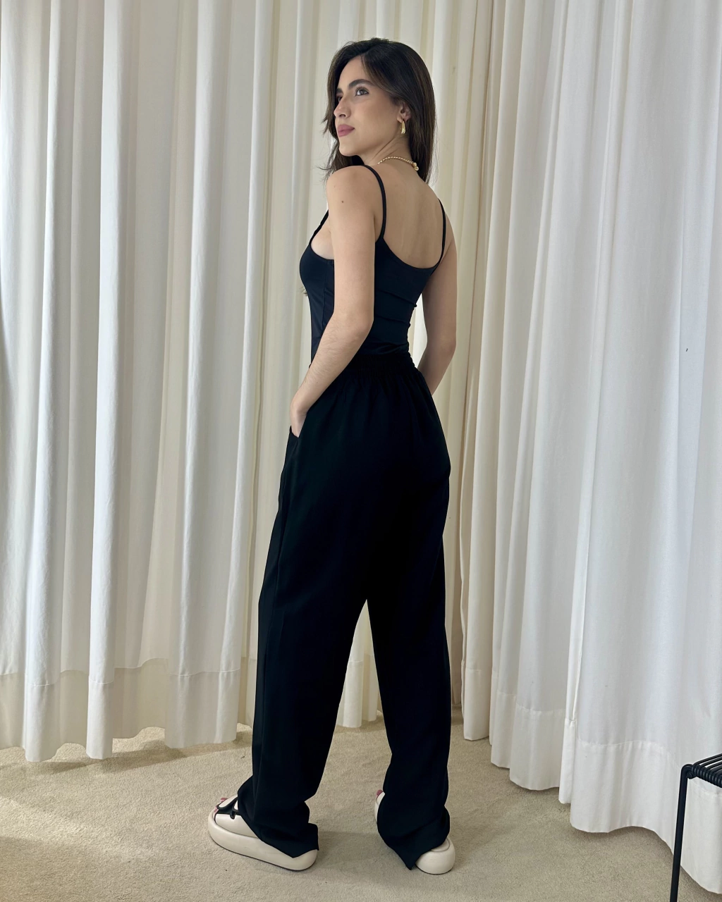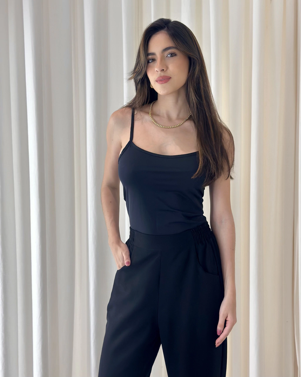 Calça confeccionada em tecido plano (92%viscose 8% poliéster), shape reto, barra mais justinha na área do tornozelo, detalhe de elástico na área do cós, não possui ziper ou botão