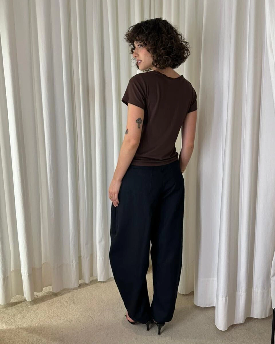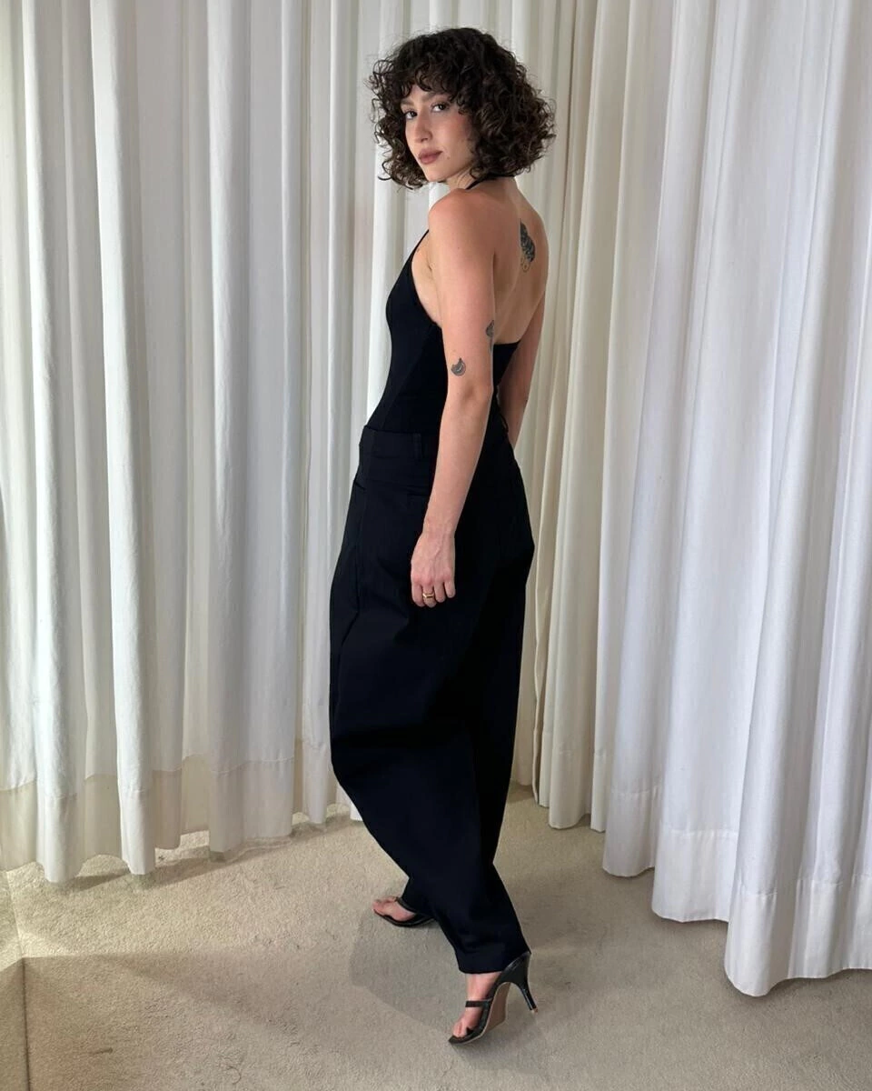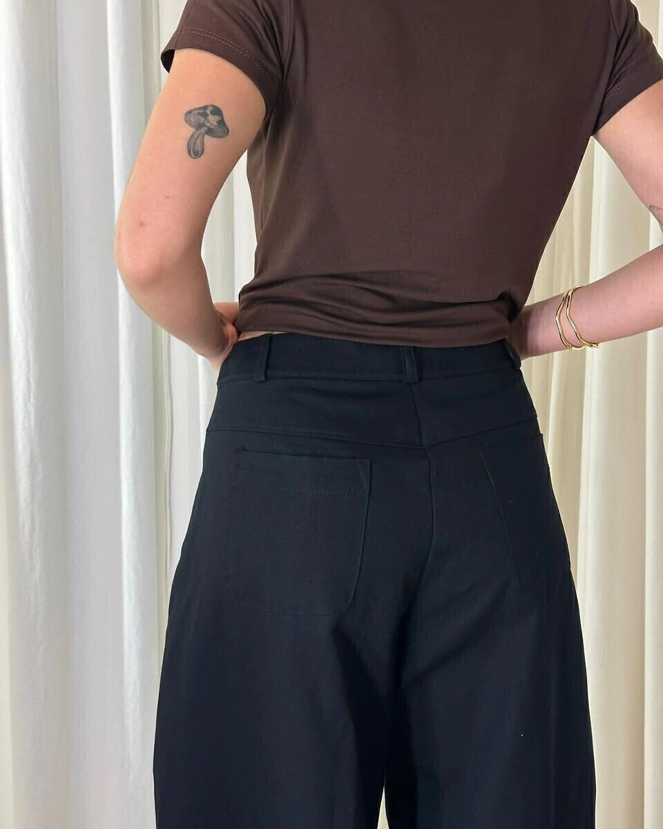 A Calça Spencer é a peça que traduz modernidade e personalidade no look. Com modelagem ampla e estrutura arredondada, ela cria um volume contemporâneo que transforma qualquer produção. O caimento é firme e elegante, mantendo a forma sem pesar, ideal para quem ama alfaiataria com identidade. O cós é estruturado, com passantes e fechamento frontal, garantindo ajuste confortável. A parte de trás conta com bolsos aplicados, enquanto a frente tem pregas suaves que dão movimento e refinamento à peça. Feita em tecido encorpado e de toque macio, a Spencer une conforto e presença. O preto absoluto reforça a versatilidade, permitindo combinações infinitas, do básico sofisticado ao look statement.