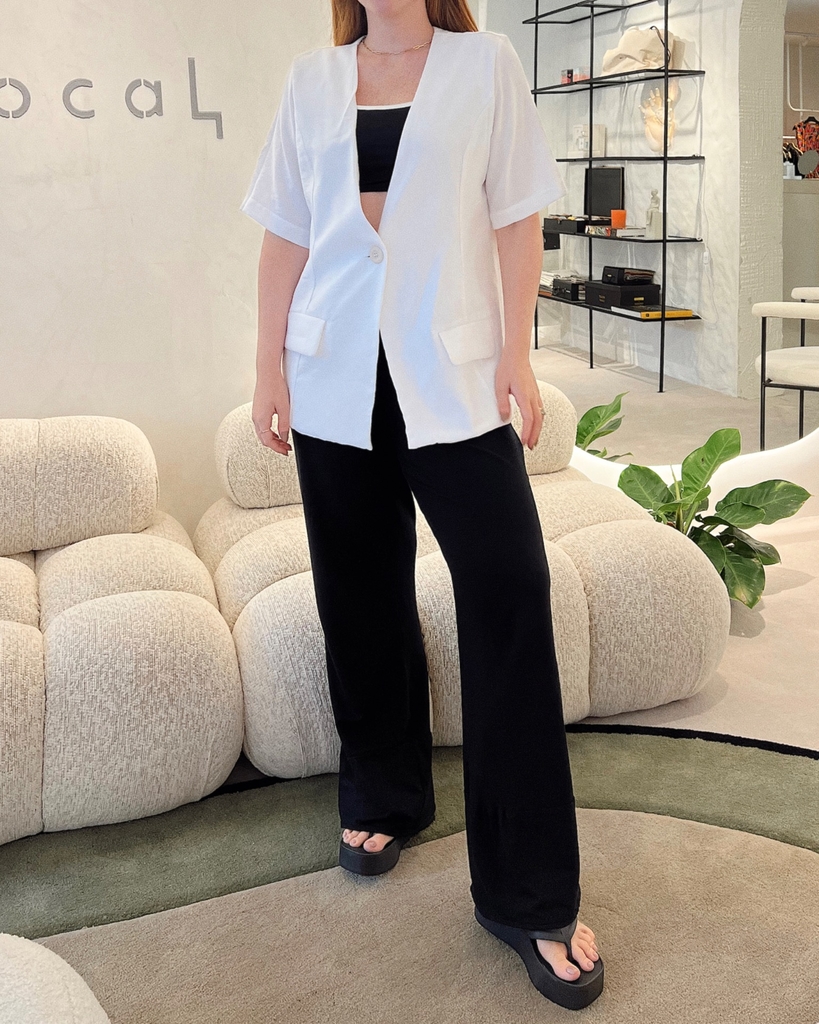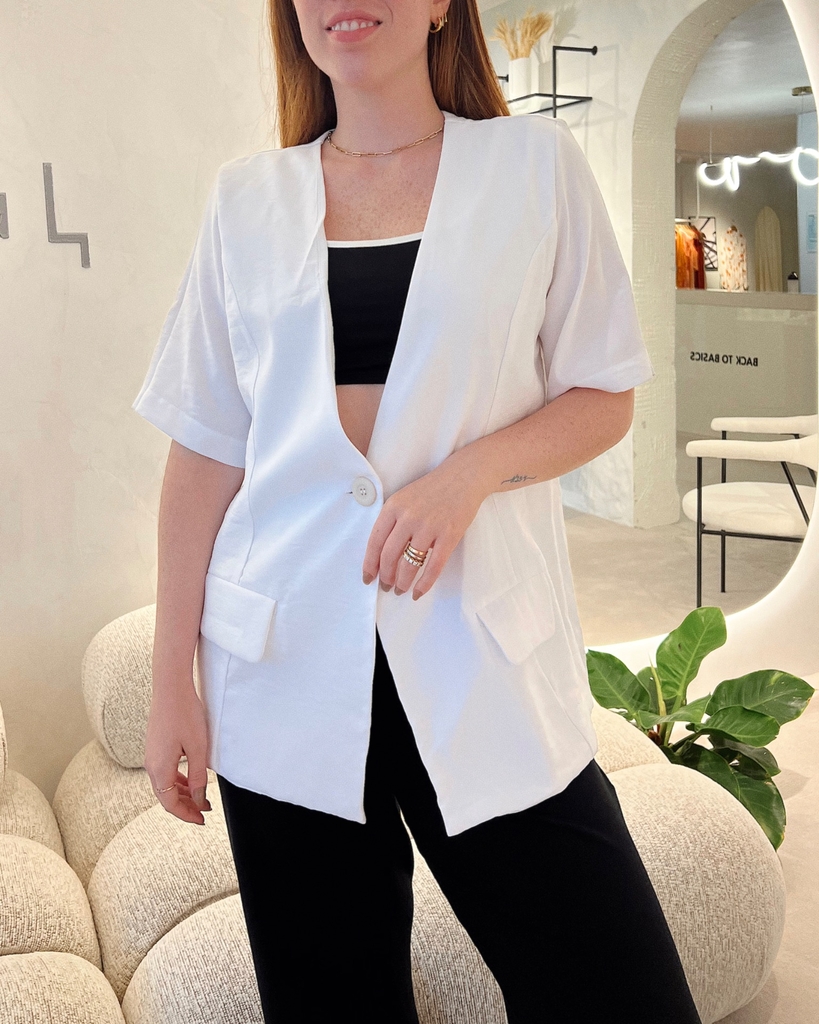 Camisa com modelagem ampla, mangas curtas, único botão frontal, bolsos falsos frontais e levemente acinturada. A peça perfeita para usar como top em dias mais quentes ou sobreposição em looks mais fresh.