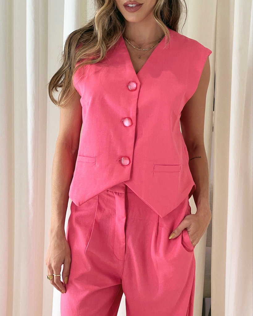 Colete com shape de alfaiataria clássica. Confeccionado em linho misto (48% poliéster, 27% algodão, 14% viscose, 11% linho). Possui três botões e dois bolsos frontais.