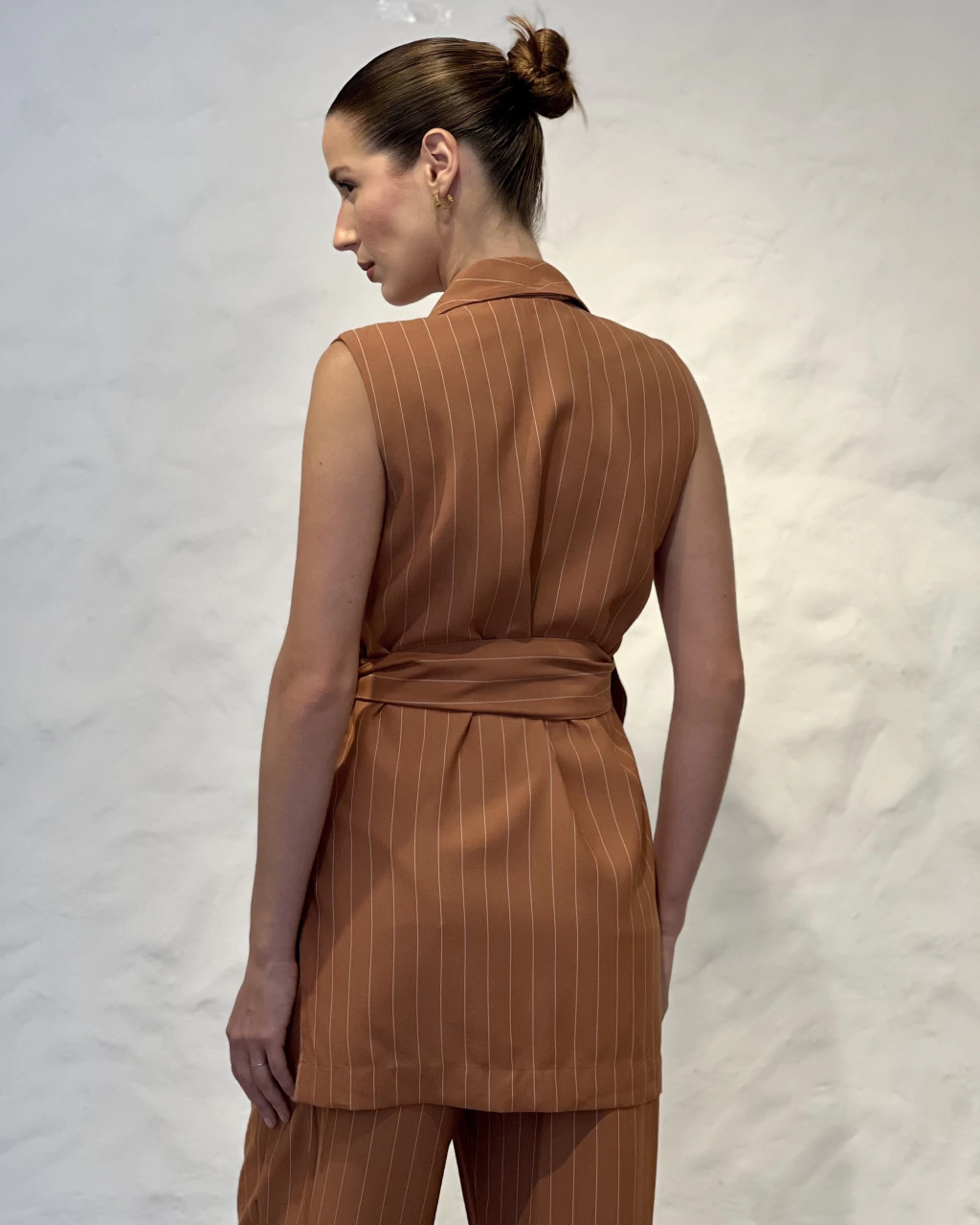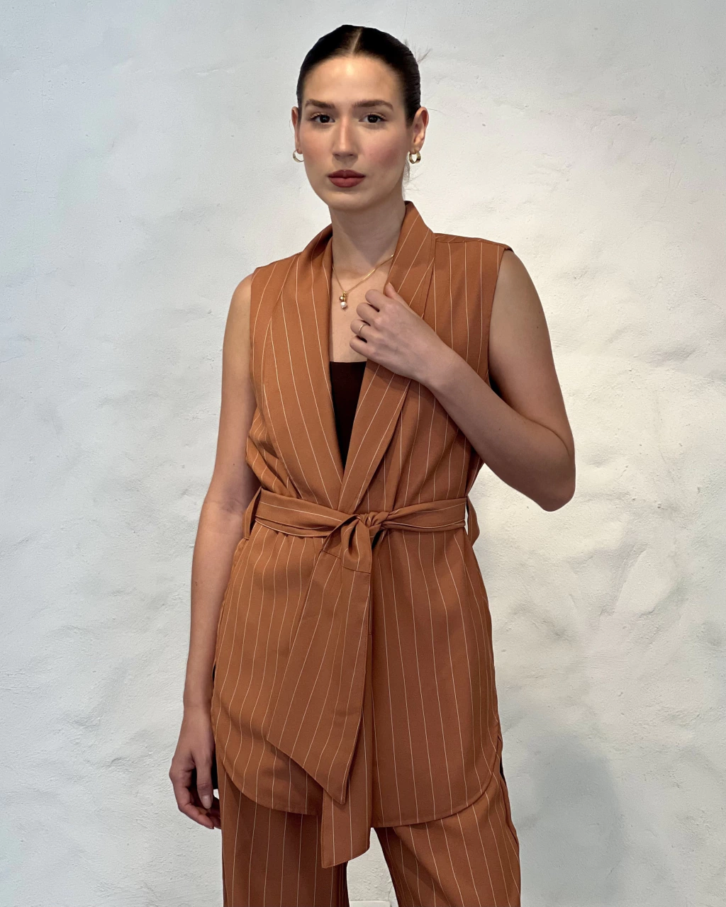 Colete confeccionado em crepe (92% viscose 8% poliéster), decote V, comprimento longo, barra frontal arredondada e recorte lateral. Possui lapelas largas, passantes laterais e faixa para amarração.
