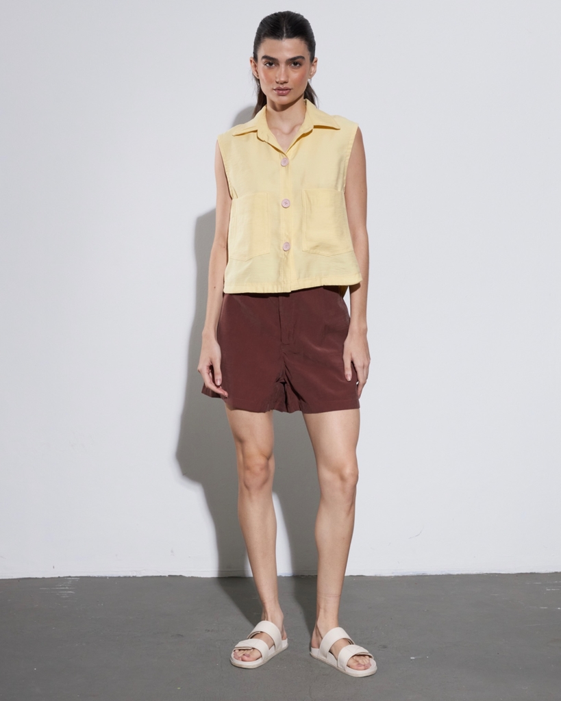 Confeccionado em crepe encorpado (90% viscose 10% poliester), o colete Thera possui dois bolsos e três botões frontais, shape amplo e moderno. Perfeito para ser usado como blusa ou sobreposição.