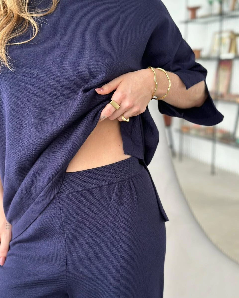 O Conjunto Anna é a definição de elegância com conforto. Produzido em malha tricot e de toque macio, traz uma blusa de shape amplo com mangas médias e pequenas fendas laterais, aliada à calça de cintura alta e modelagem reta, que garante caimento impecável. O visual monocromático cria uma proposta moderna, minimalista e versátil, perfeita para o dia a dia com um toque sofisticado.