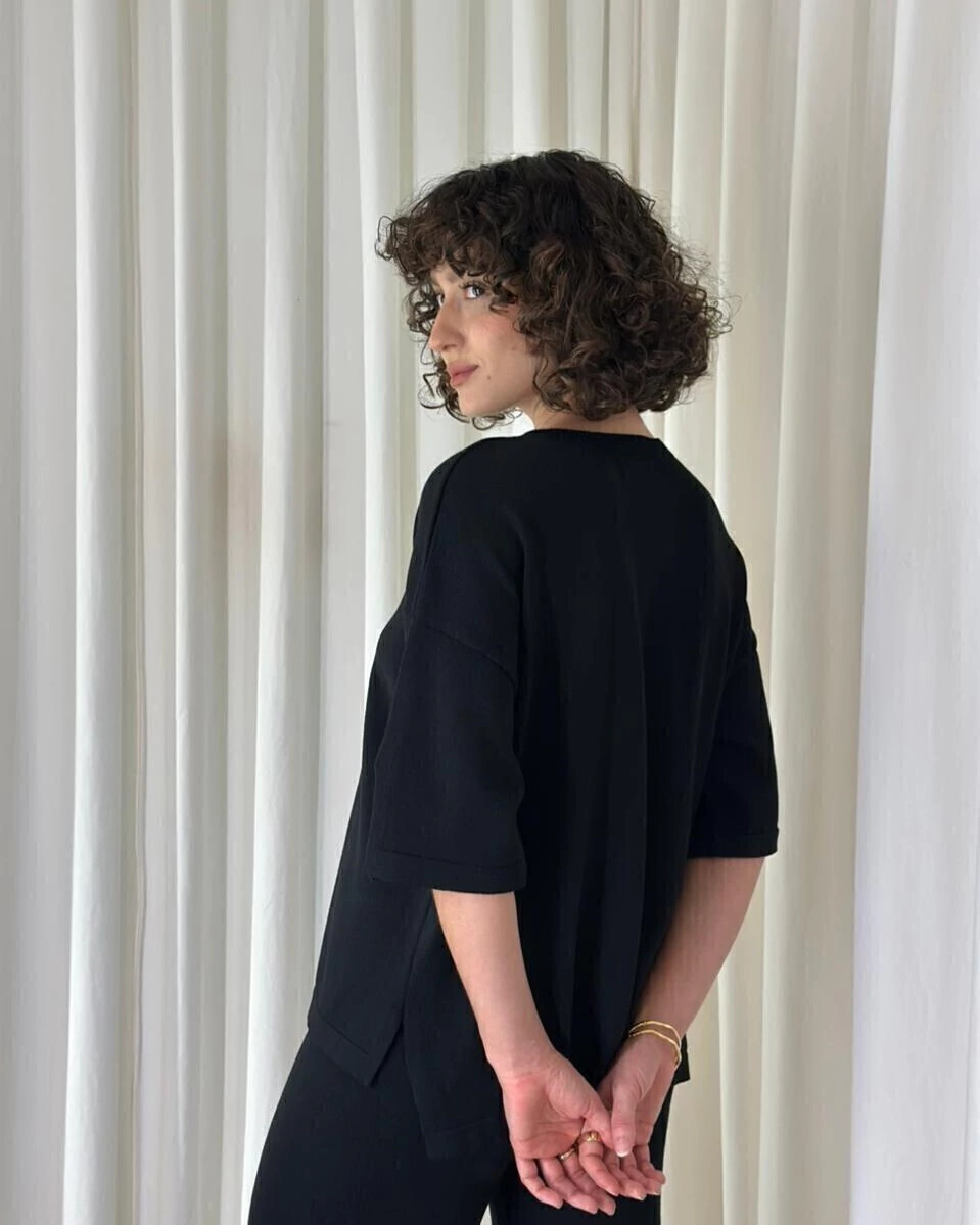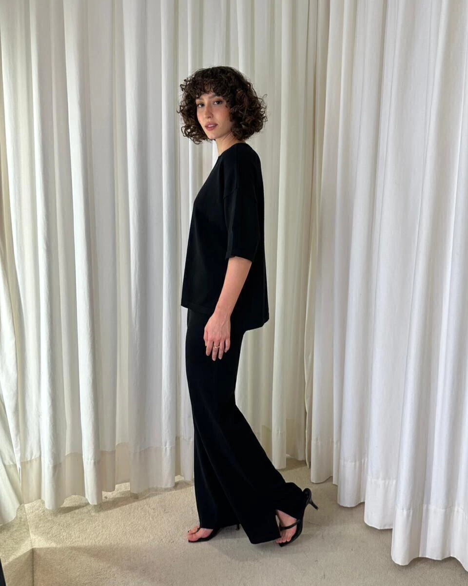 Conforto absoluto com estética minimalista. O Conjunto Anna chega em um tom preto sofisticado, perfeito para quem ama looks clean e fáceis de combinar. A blusa possui modelagem ampla com mangas mais curtas e cava deslocada, garantindo um visual moderno e um caimento leve no corpo. O decote careca mantém a proposta atemporal e elegante. A calça segue a mesma linha de conforto, com cintura média e caimento reto que alonga a silhueta. O toque especial aparece na barra com pequena fenda lateral, que traz movimento e um detalhe discreto, porém cheio de estilo. Um conjunto versátil que te acompanha do escritório ao final de semana, sem esforço para ficar estilosa.