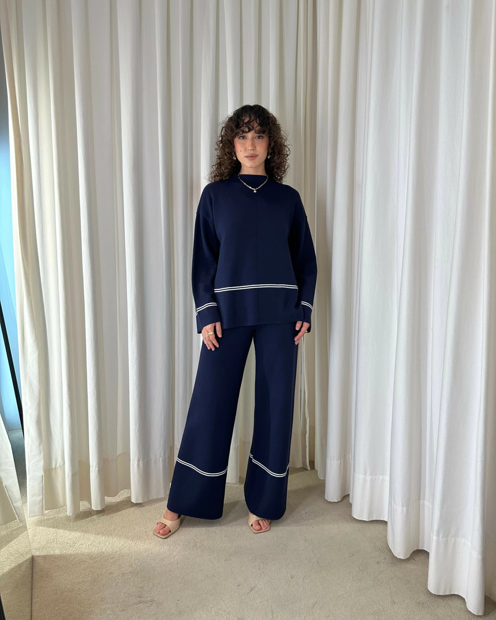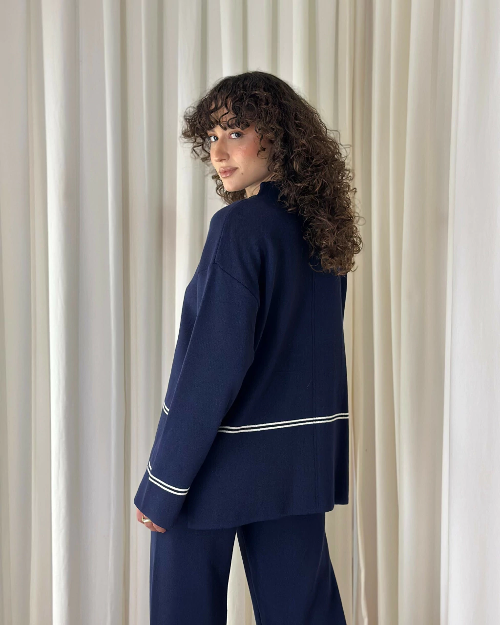 Conjunto em tricot estruturada na cor azul-marinho, composto por blusa de modelagem reta com gola alta, mangas longas e detalhe de listras brancas nos punhos e barra. A calça tem caimento amplo, cós elástico e o mesmo acabamento em listra na barra, garantindo harmonia ao visual. Um look elegante e confortável, ideal para produções versáteis.