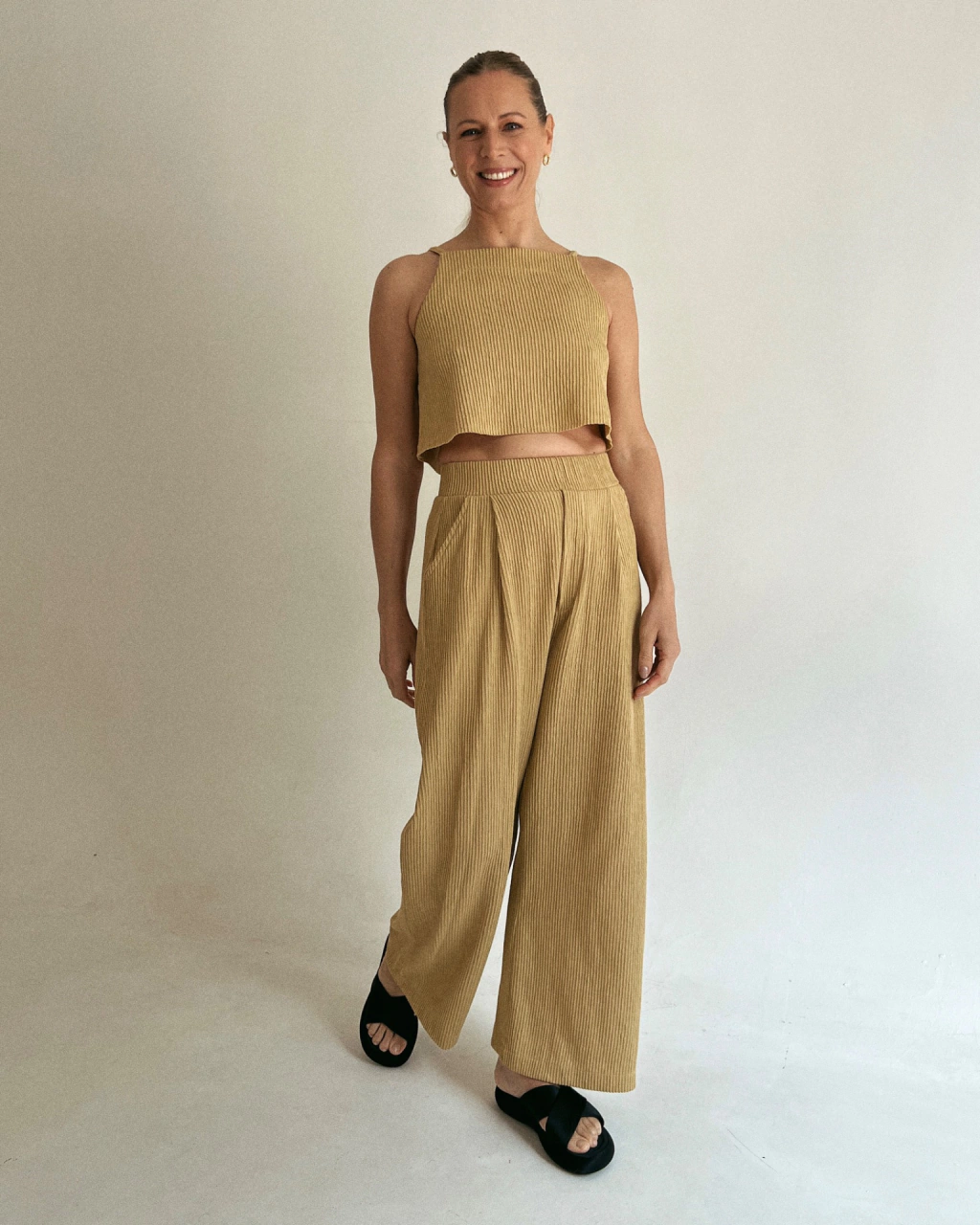 Cropped de tecido encorpado com textura (72% algodão 28% poliéster), alças finas e shape reto