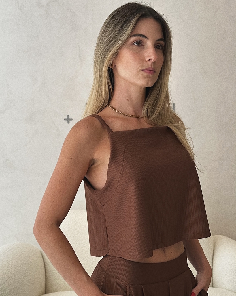 Cropped de tecido encorpado com textura (97% poliéster 3% elastano), alças finas e shape reto