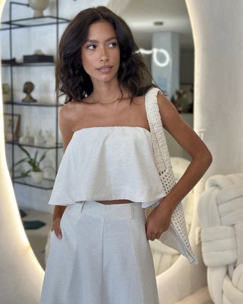 Cropped sem alças, com top reto interno, elástico embutido na área superior do busto e babado por cima. Fechamento posterior em zíper reforçado.