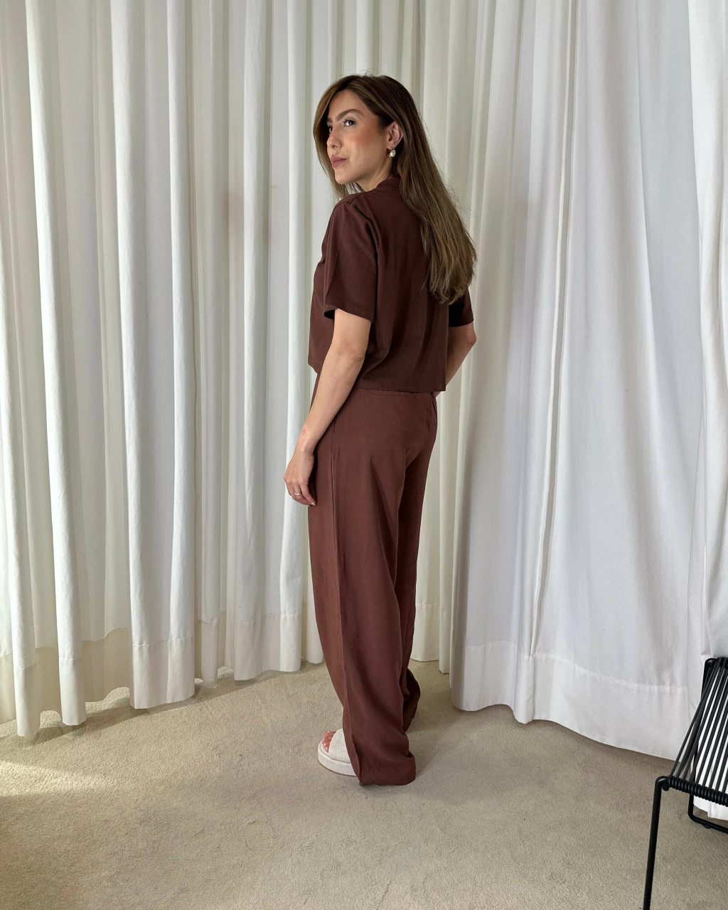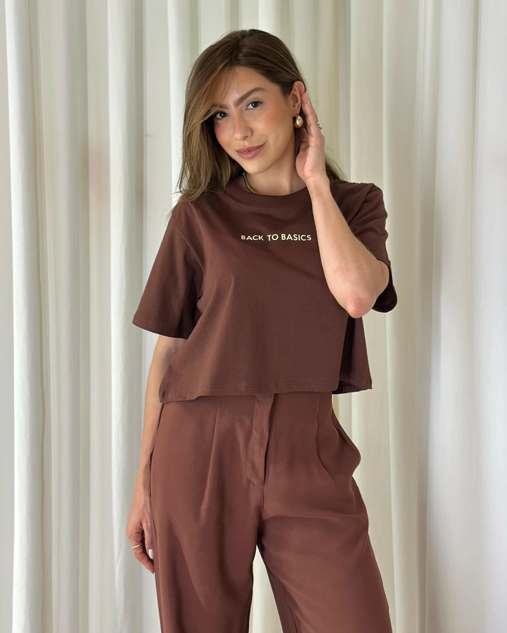 Cropped em malha de algodão com modelagem reta e comprimento mais curto. Possui mangas curtas, gola careca e estampa centralizada com a frase “BACK TO BASICS” em lettering minimalista. O tom terroso transmite aconchego e sofisticação, ideal para compor looks casuais com conforto e estilo.