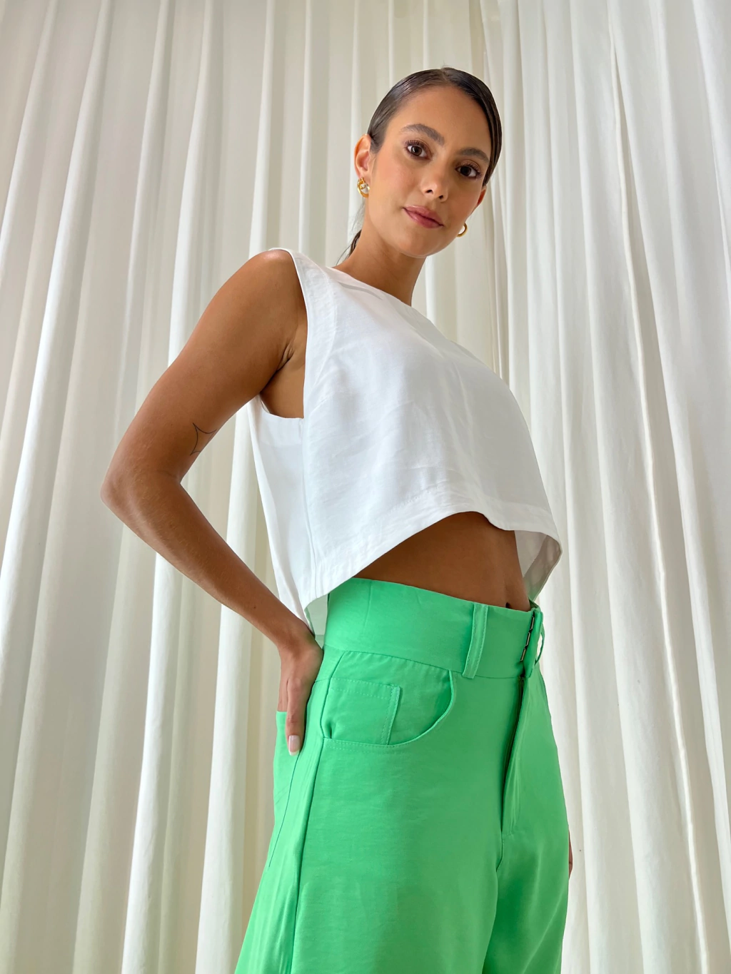 BEST-SELLER: Cropped em crepe (92% viscose, 8% poliester). Possui modelagem com barras assimétrica, fechamento em zíper posterior, decote fechado e shape minimalista.