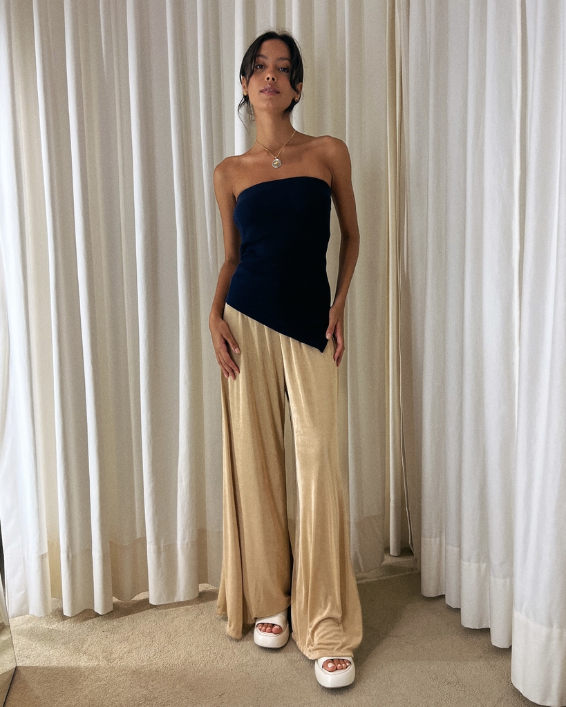 Calça pantalona com shape amplo e cós de elástico em tecido flúido de malha Jersey (92% poliéster 8% elastano).
