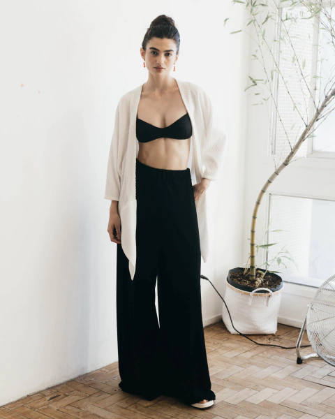 Calça pantalona com shape amplo e cós de elástico em tecido texturizado (97% poliester 3% elastano). Possui caimento leve e fluido.