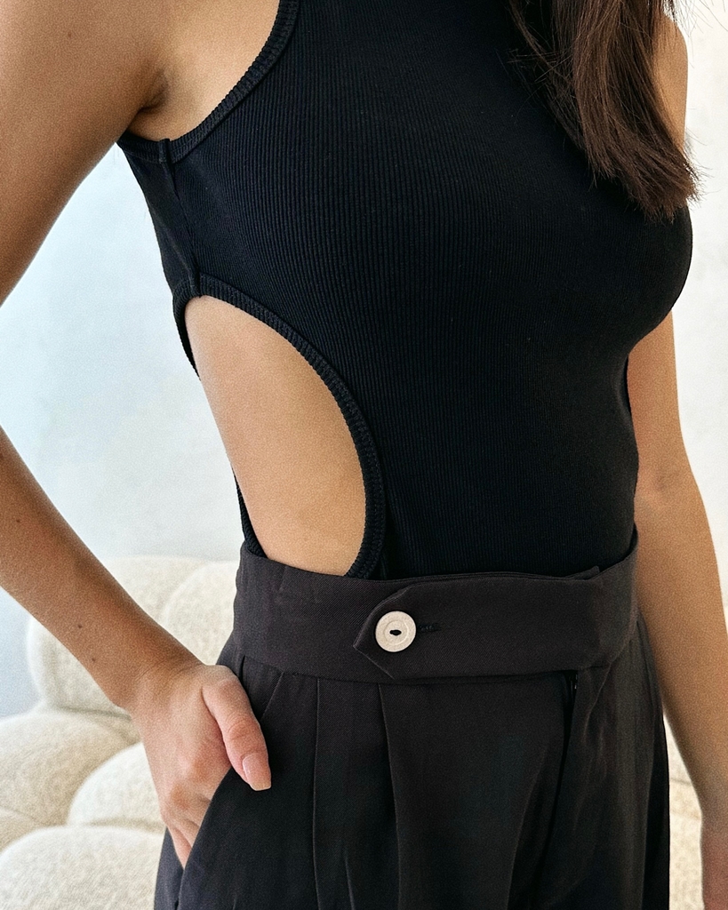 Regata em malha canelada 96% algodão 4% elastano com recortes laterais, Modelagem moderna e confortável.
