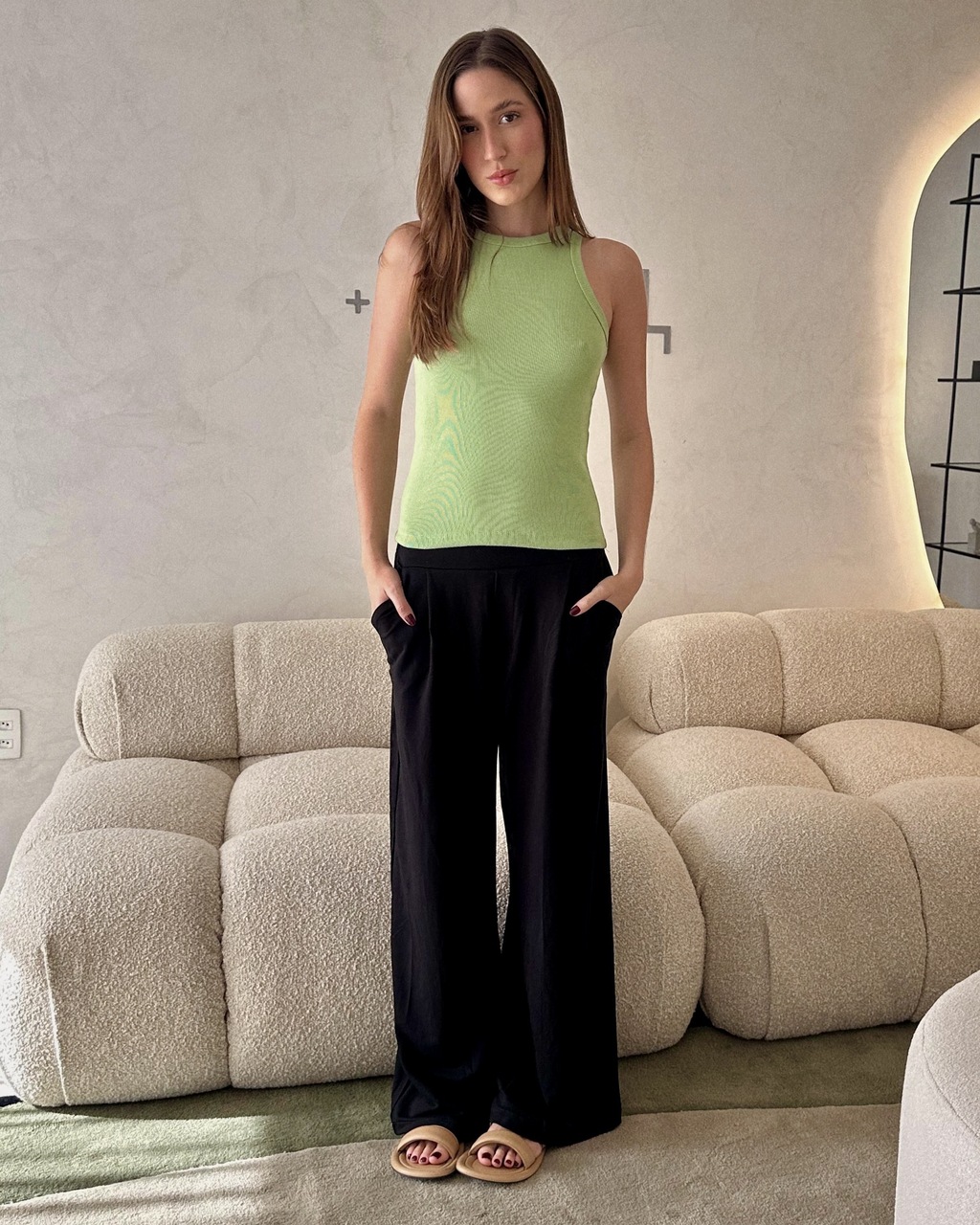 Básica, mas nada óbvia. A Regata Klum traz um shape ajustado com tecido canelado e elasticidade na medida certa para valorizar o corpo com conforto. A gola levemente mais alta e o acabamento nas cavas dão um toque moderno à peça.Versátil, ela transita do look casual com jeans à produção mais sofisticada com alfaiataria e acessórios.