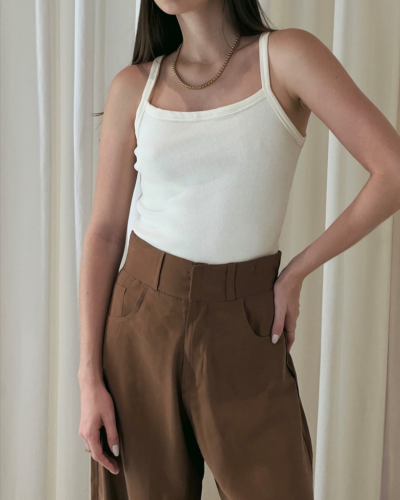Regata confeccionada em malha canelada de algodão (96% algodão 4% elastano). Possui decote reto e alças finas. Modelagem ajustada ao corpo.