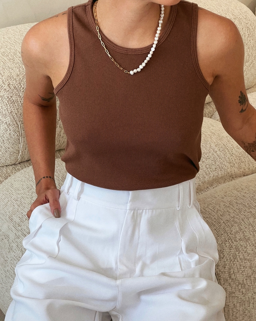 Regata confeccionada em malha canelada de algodão (96% algodão 4% elastano). Possui decote arredondado e alças largas. Modelagem ajustada ao corpo.