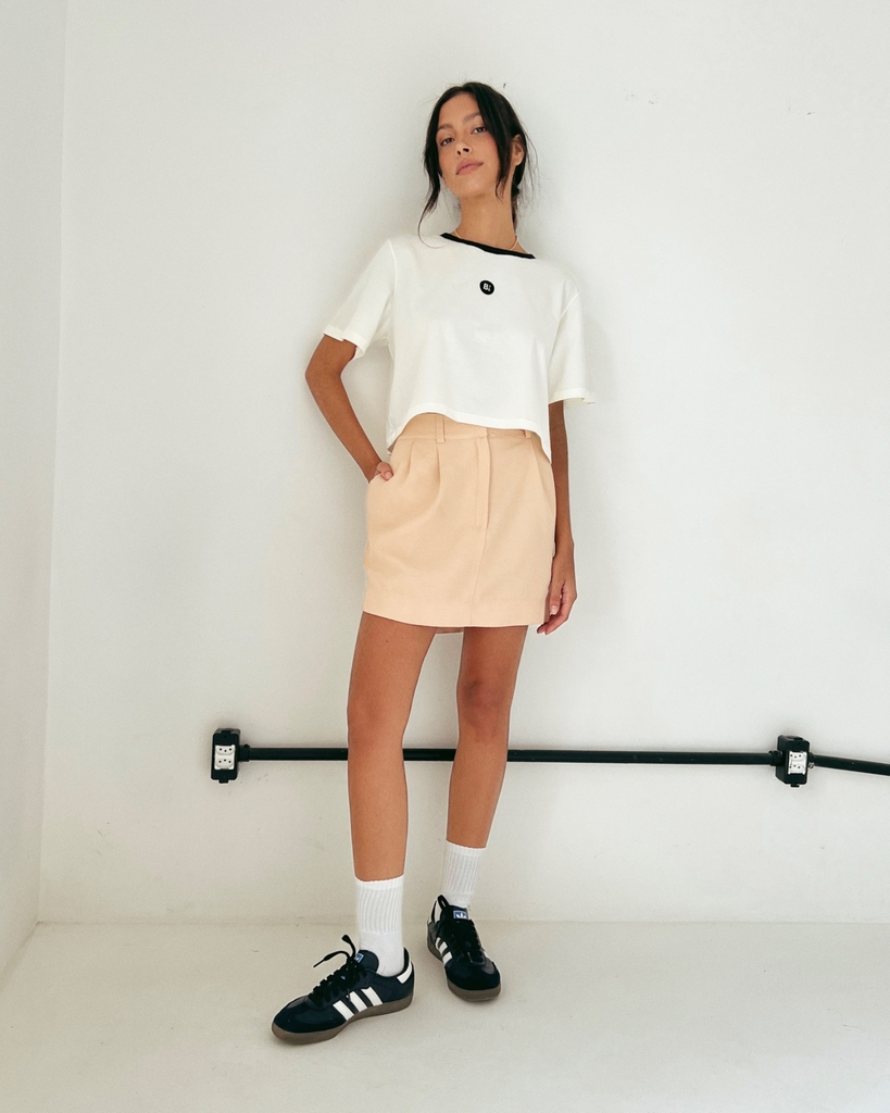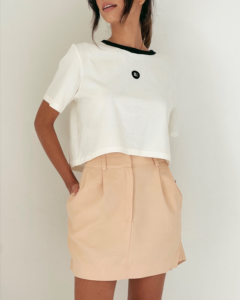 Saia no comprimento curto, tecido crepe (92% viscose 8% poliéster). Possui cós com passantes aplicados, dois bolsos laterais, caimento mais justo na cintura e solto na área do quadril e detalhe de pregas na frente e atrás. Fechamento frontal em zíper e colchetes.