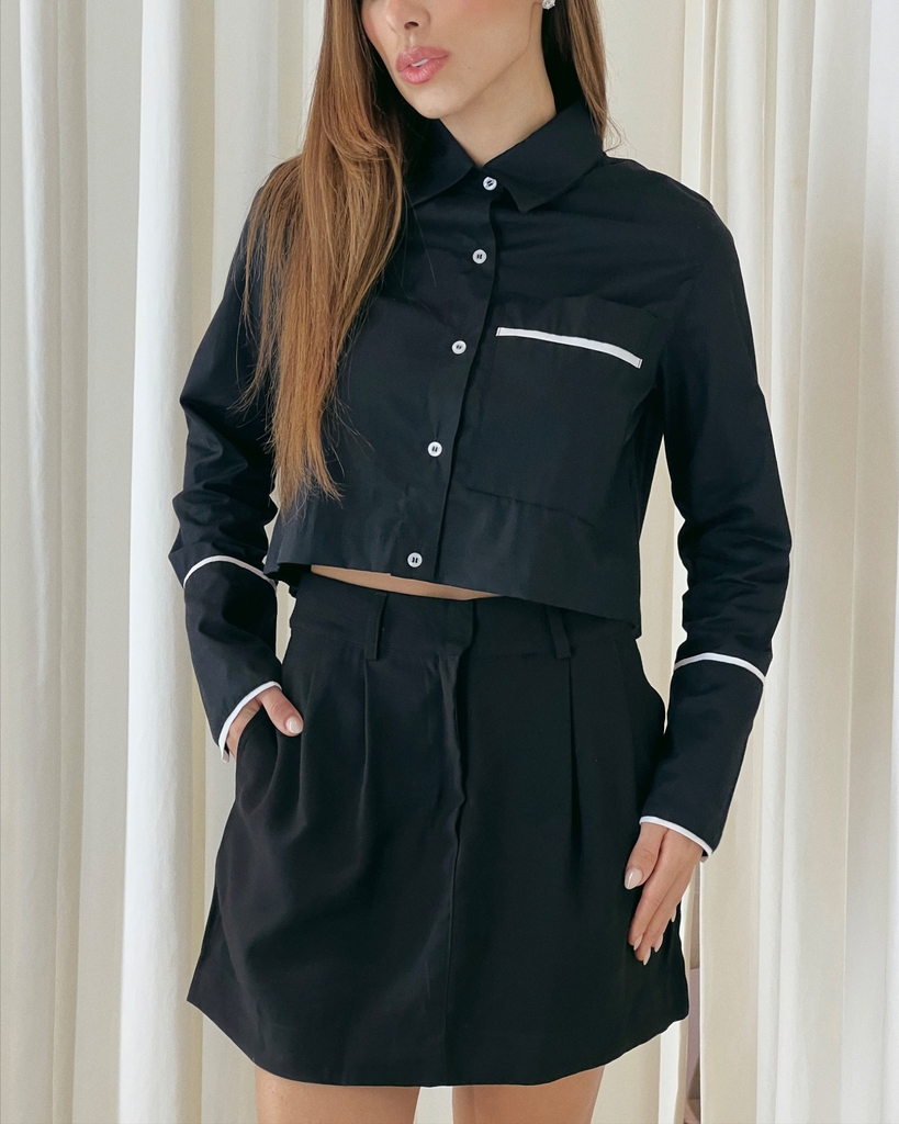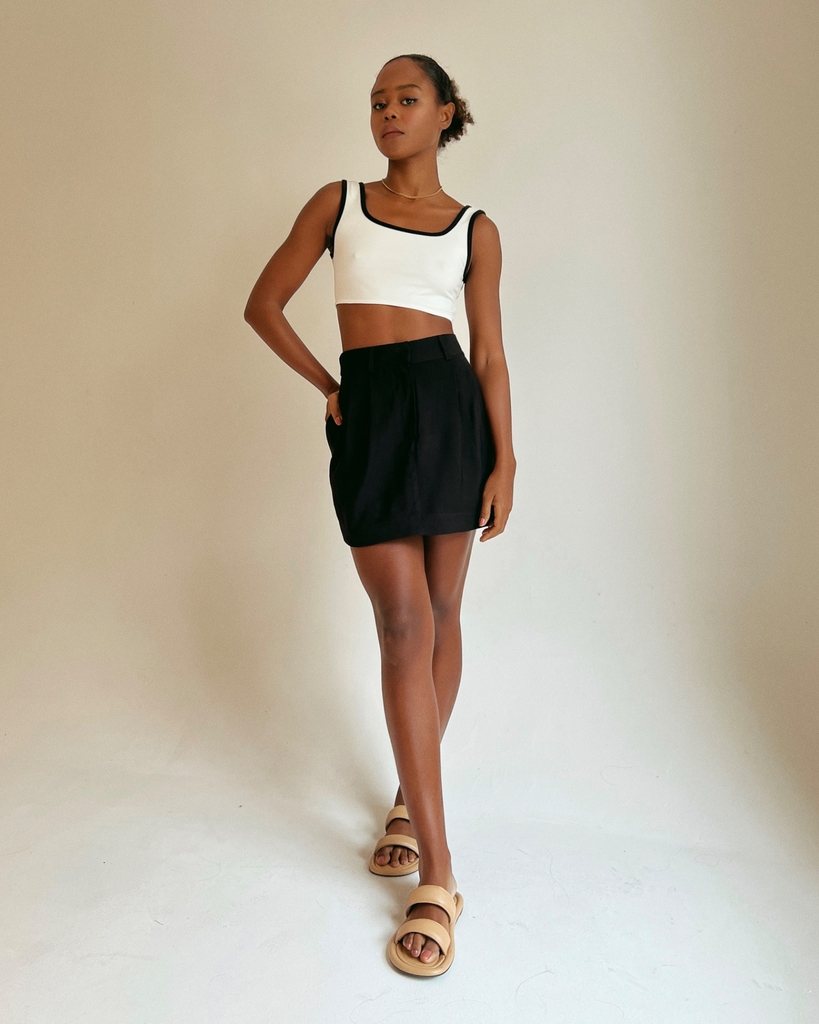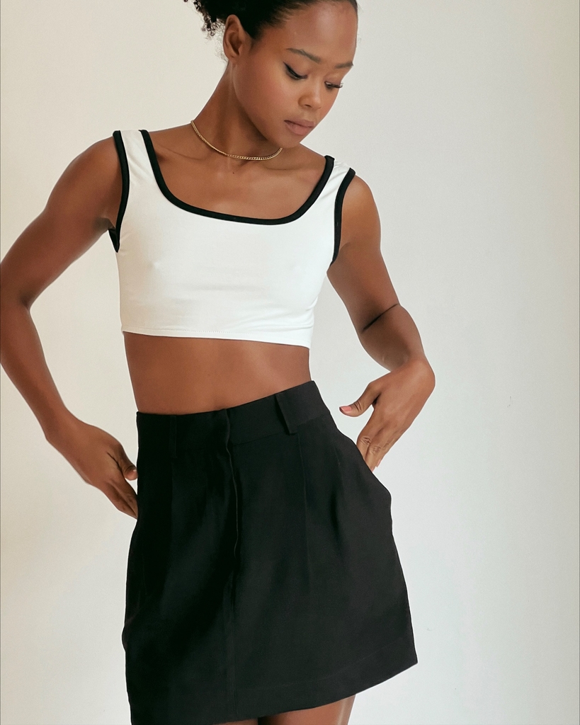Saia no comprimento curto, tecido crepe (92% viscose 8% poliéster). Possui cós com passantes aplicados, dois bolsos laterais, caimento mais justo na cintura e solto na área do quadril e detalhe de pregas na frente e atrás. Fechamento frontal em zíper e colchetes.
