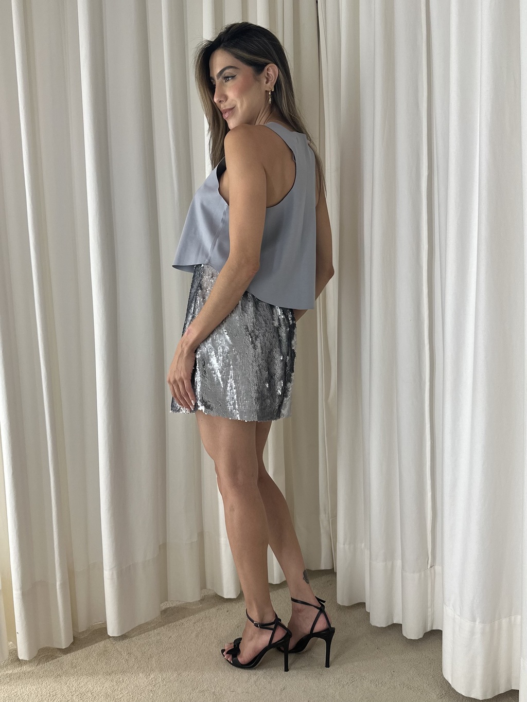Saia confecionada em tecido borado de paetês prateados, possui forro interno (100% poliéster), fechemento posterior em zíper cinza, comprimento curto e cintura alta.