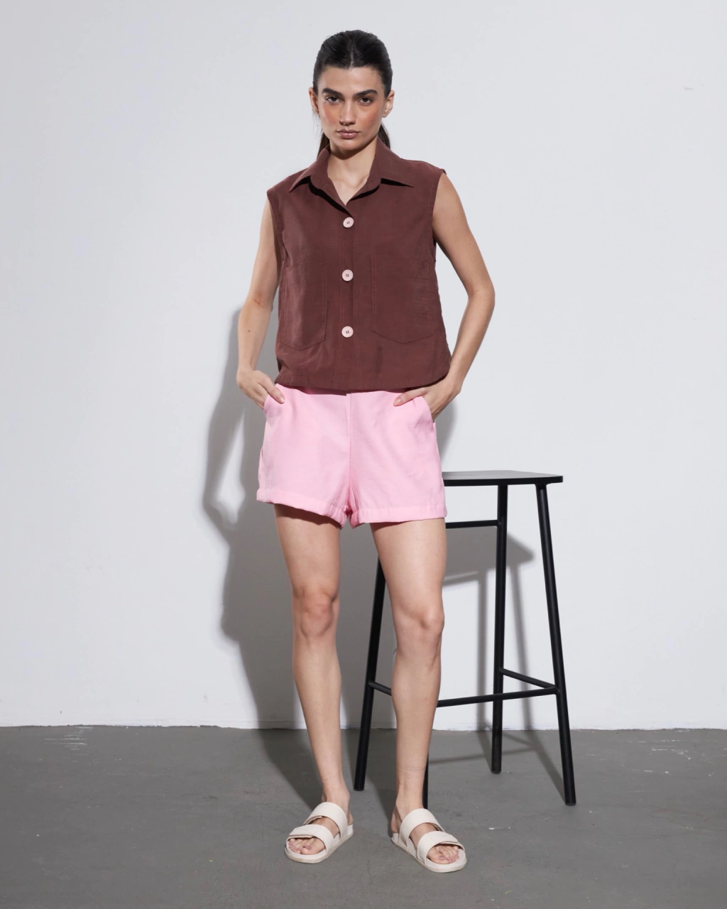 Short com bolsos frontais, fechamento lateral com zíper invisível. O Lumi tem comprimento mais curto, modelagem justa ao corpo na cintura e solta no quadril e pernas.