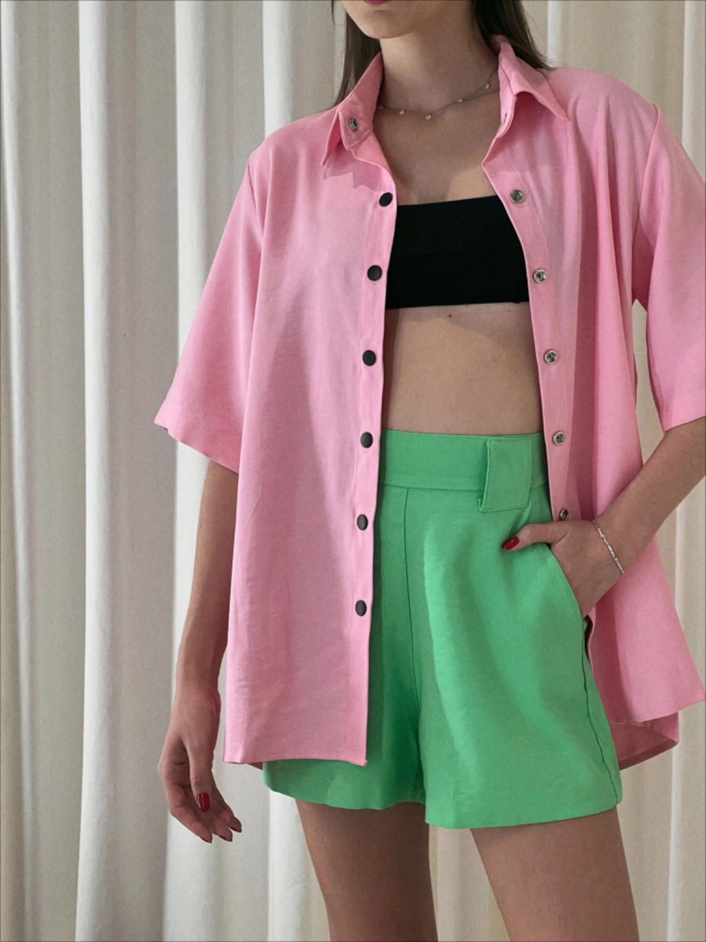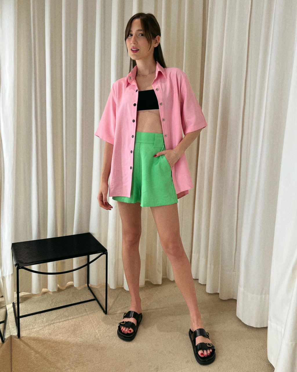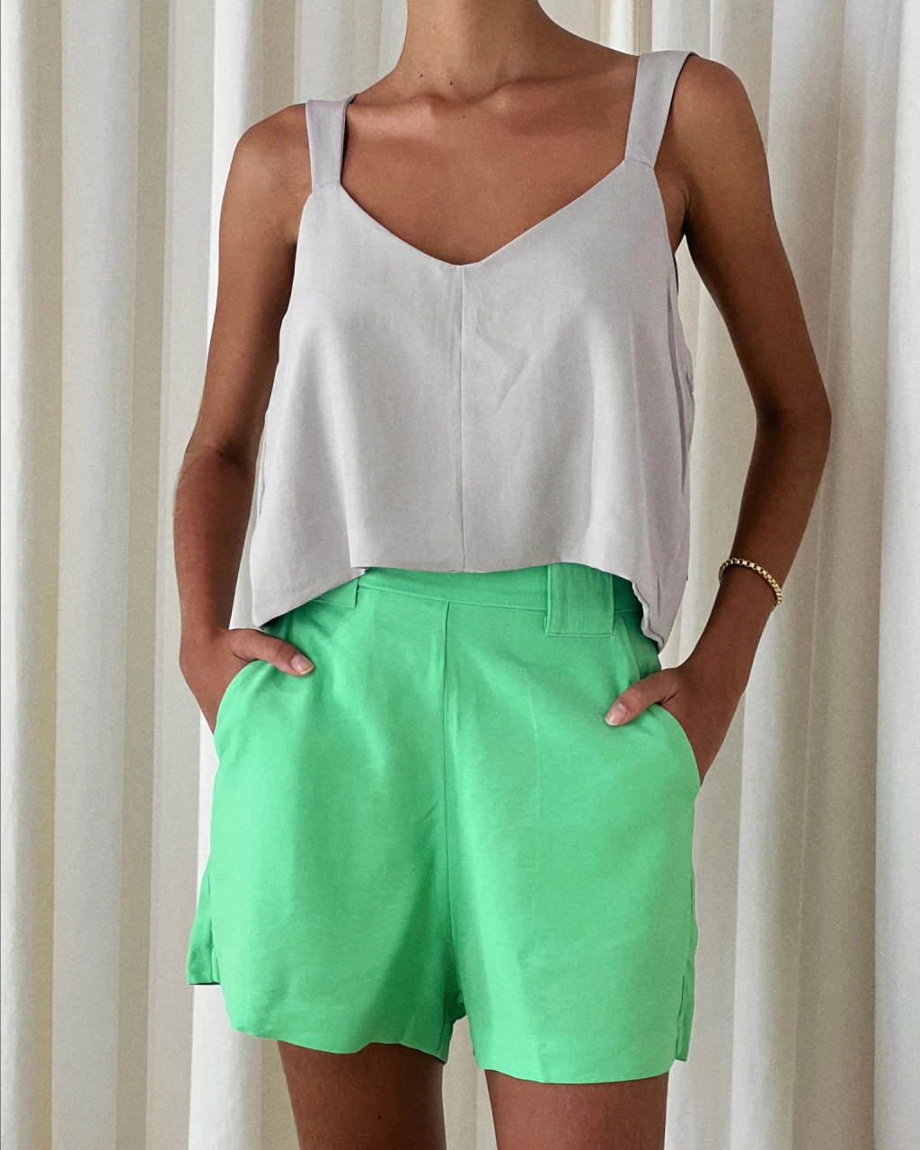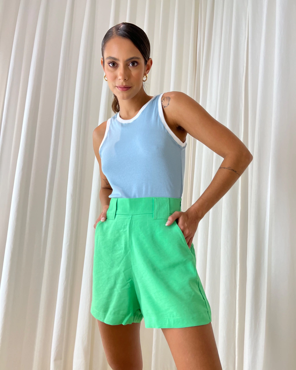 Short com bolsos frontais, fechamento lateral com zíper invisível. O Lumi tem comprimento mais curto, modelagem justa ao corpo na cintura e solta no quadril e pernas.