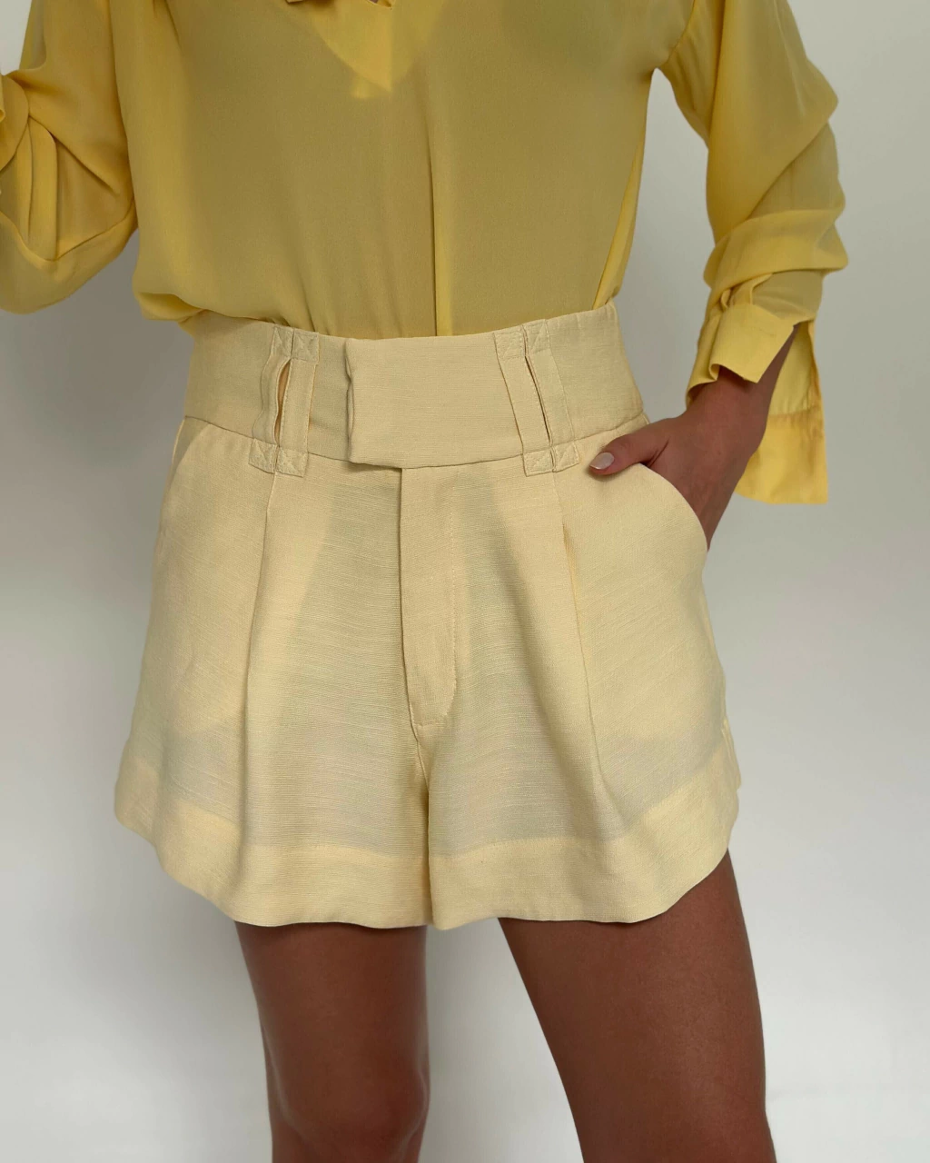 O short Palm é a peça-chave para composições leves e elegantes. Confeccionado em tecido de toque macio, ele traz cintura alta com cós largo estruturado, passantes duplos e fechamento frontal discreto, proporcionando caimento impecável. Possui pregas frontais sutis que garantem sofisticação e bolsos laterais funcionais, unindo praticidade e estilo.