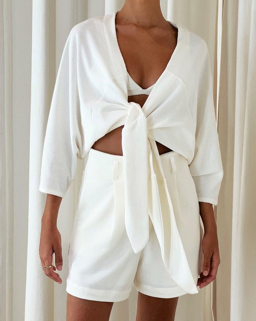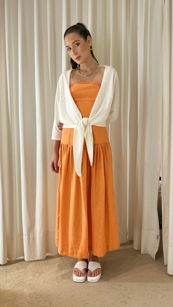 Sobreposição em tecido encorpado com detalhe em tramas (100% poliéster), mangas 3/4 e pontas longas permitindo o uso abaerto ou amarrado na cintura.