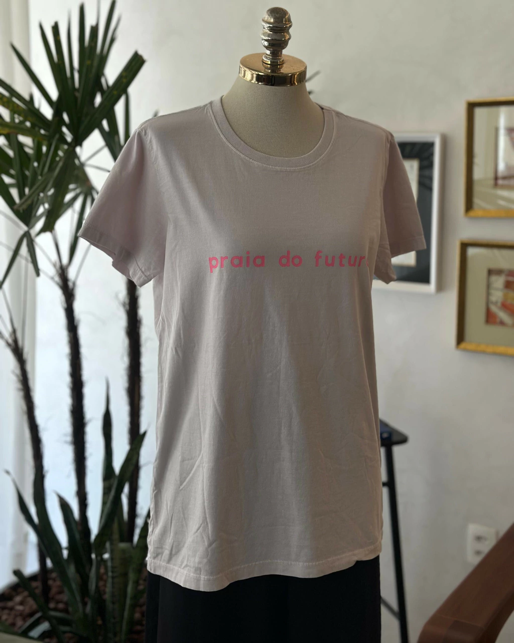 Confeccionada em malha 100% algodão, a T-shirt possui modelagem reta, caimento confortável e estampa frontal com a frase “praia do futuro” em tipografia minimalista. O tom cinza claro traz frescor e leveza à peça, ideal para composições descomplicadas com um toque cool.
