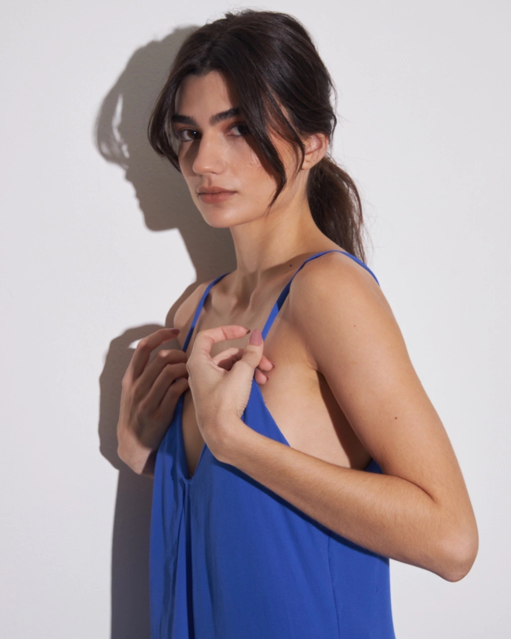 Vestido longo com decote V frontal e posterior, alças finas, forro no mesmo tecido (100% viscose) na região do busto e em algodão off-white até a metade do comprimento da peça. Feminino, moderno e super elegante.