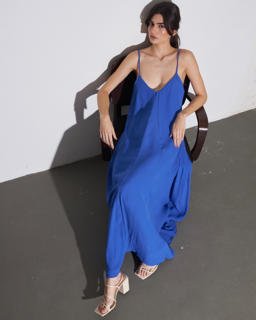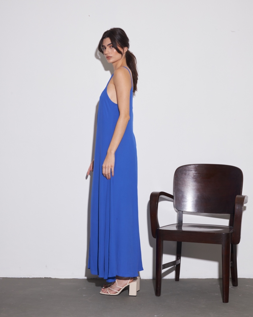Vestido longo com decote V frontal e posterior, alças finas, forro no mesmo tecido (100% viscose) na região do busto e em algodão off-white até a metade do comprimento da peça. Feminino, moderno e super elegante.