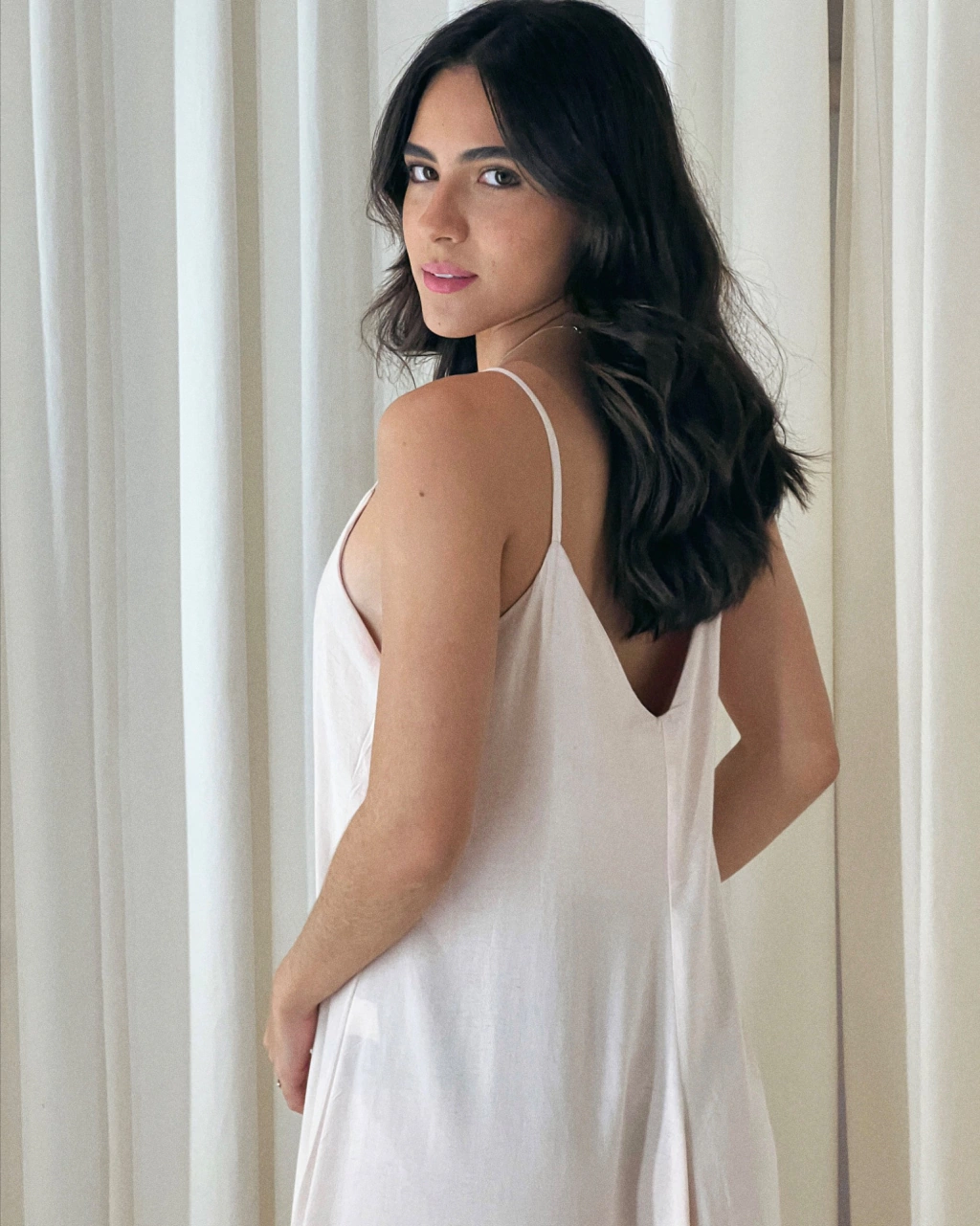 Vestido longo com decote V frontal e posterior, alças finas, forro no mesmo tecido (85% viscose 15% linho) na região do busto e em algodão off-white até a metade do comprimento da peça. Feminino, moderno e super elegante.