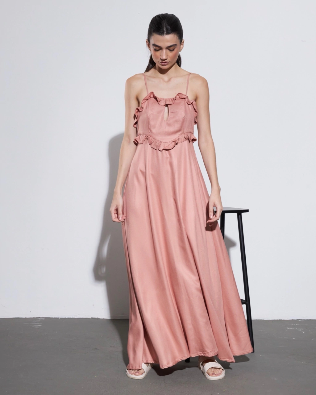 Vestido longo em crepe de viscose de alta gramatura, com detelhes de babados e recorte no busto, fechamento posterior em zíper invisível e alças finas.