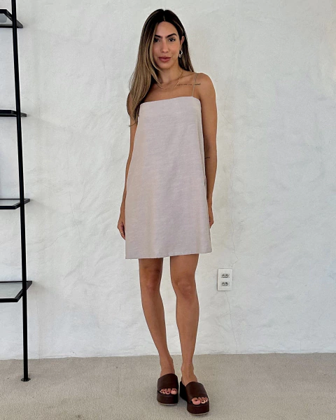 Vestido curto, confeccionado em tecido plano de viscose, possui alças finas e elásticas na cor cinza escuro.