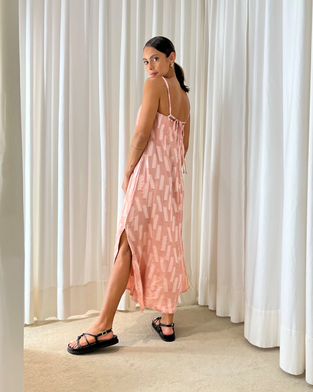 Vestido longo em tecido flúido com detalhes em relevo (100% poliéster), fachemento posterior em zíper, alças finas e ajustáveis nas costa, forro e elastico na área do busto e fendas laterias  em abos os lados da da barra.
