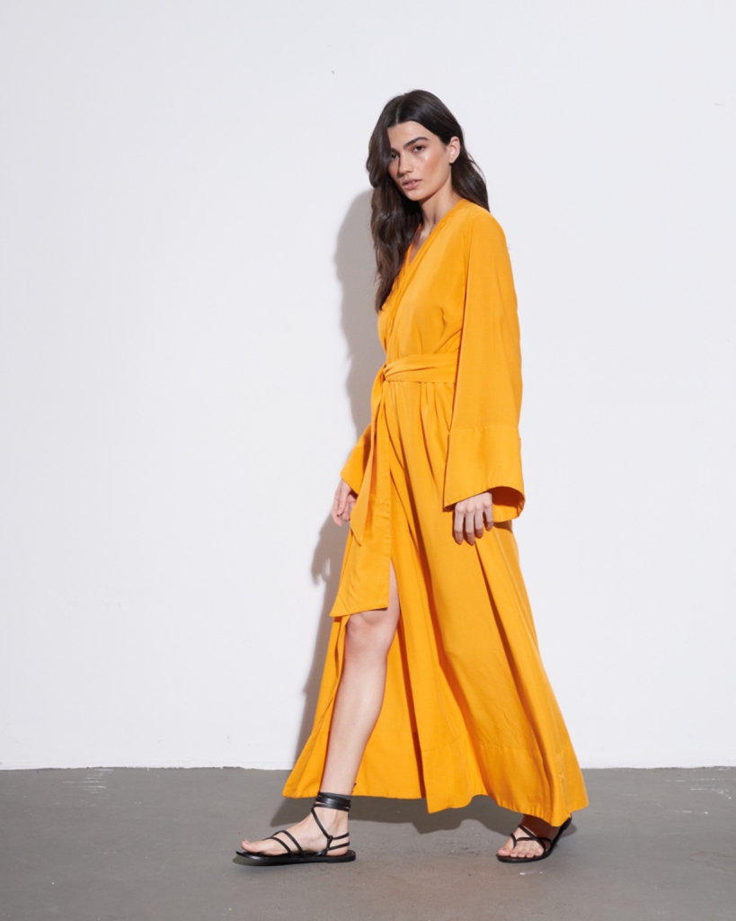 Vestido com shape de kimono, comprimento longo em viscolinho (93% viscose 7% linho), com detalhes drapeados no decote V, mangas longas, fechamento por amarração interna, botão de pressão e faixa larga inclusa para amarração.