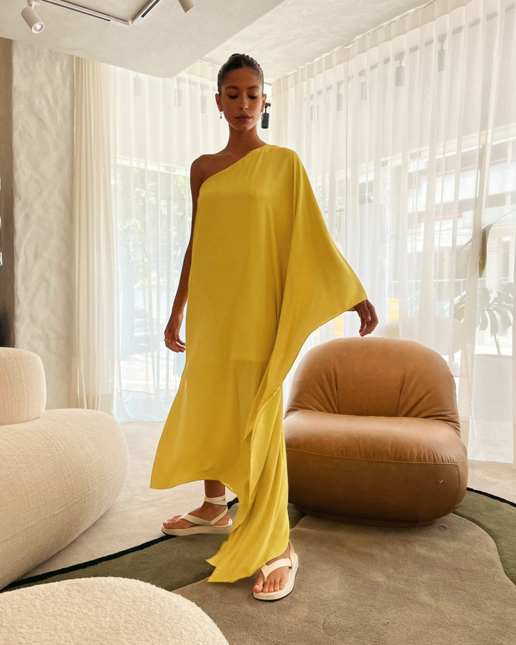 Vestido em crepe de alta gramatura, shape amplo e  modelagem de um ombro só e com assimetria. Acompanha forro em tecido de malha fria de poliamida.